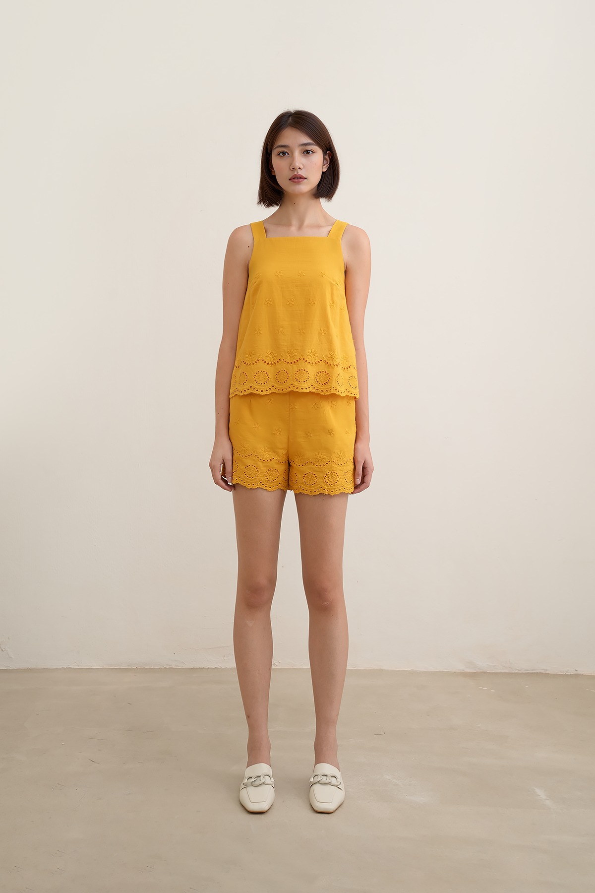 These mid-waist cotton shorts feature all-over embroidery with a scalloped edge that mirrors the top. Easy to slip on and endlessly comfortable, they’re the kind of piece you’ll reach for all season long.