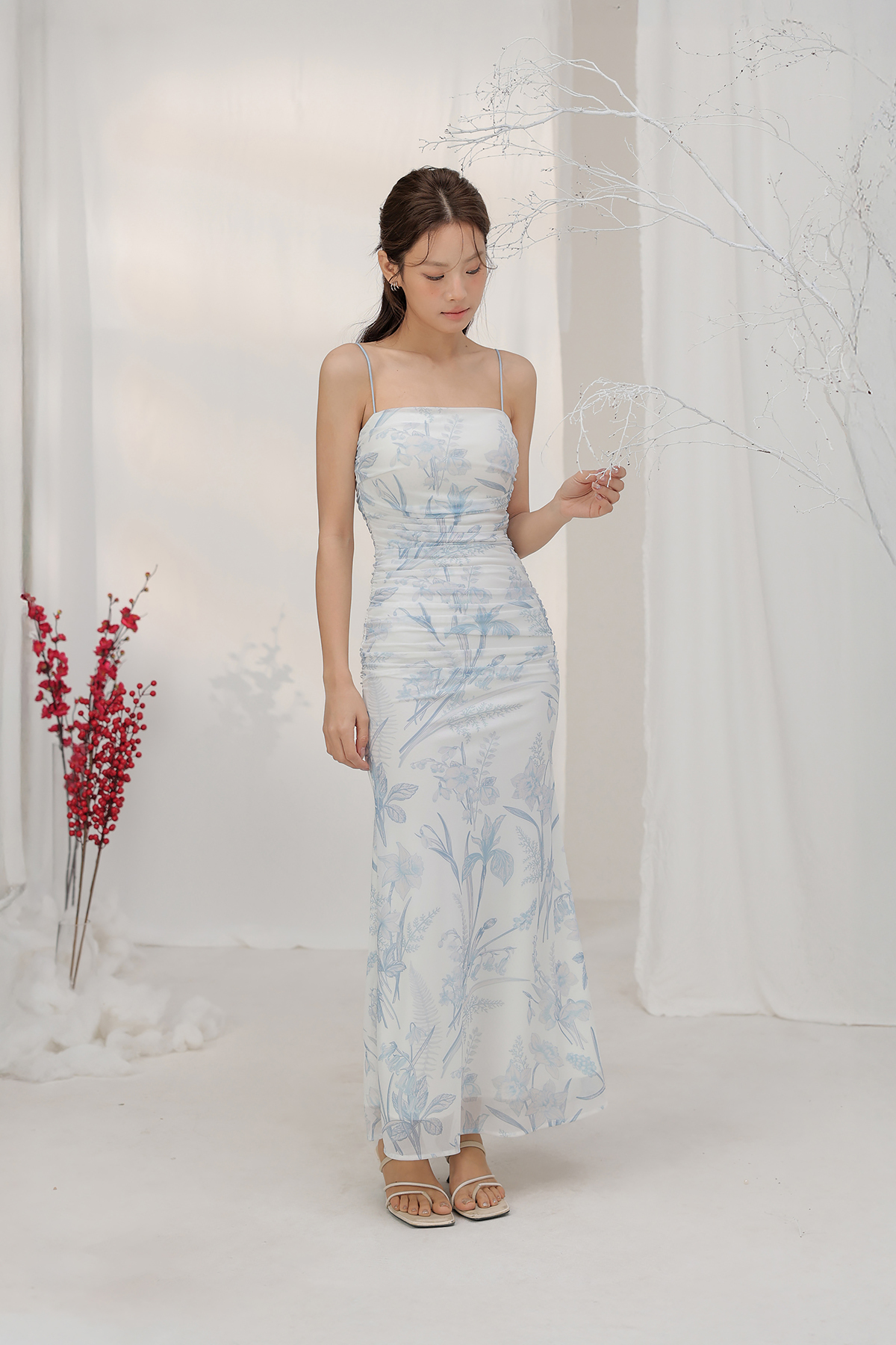 Delicately romantic — this ruched mesh maxi dress blooms with allover florals and a figure-flattering silhouette for effortless elegance.