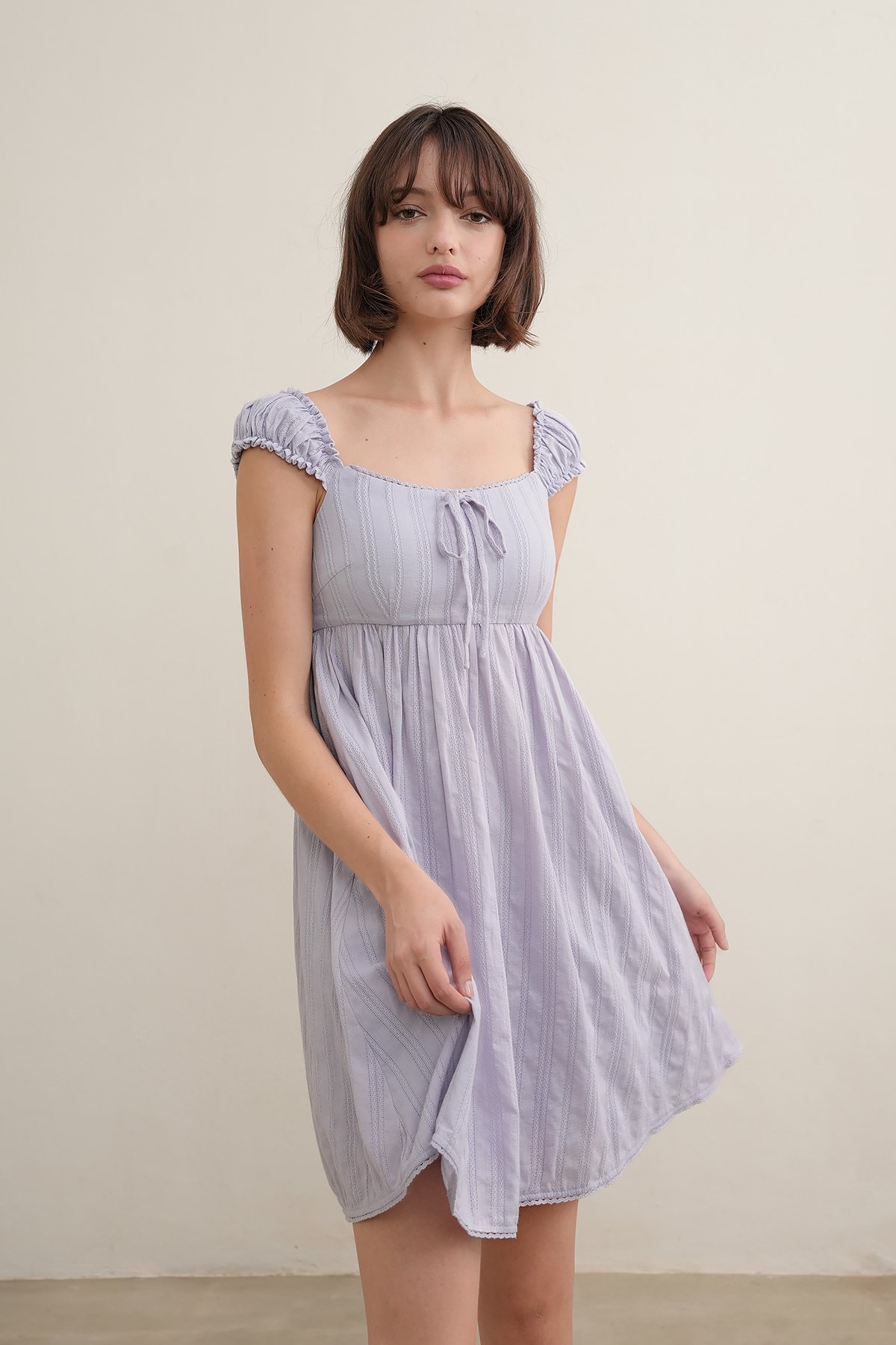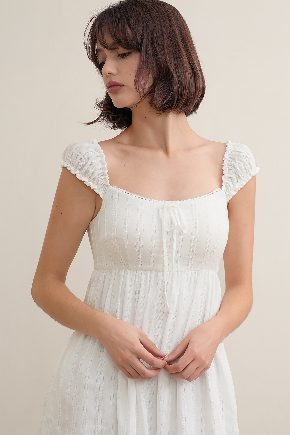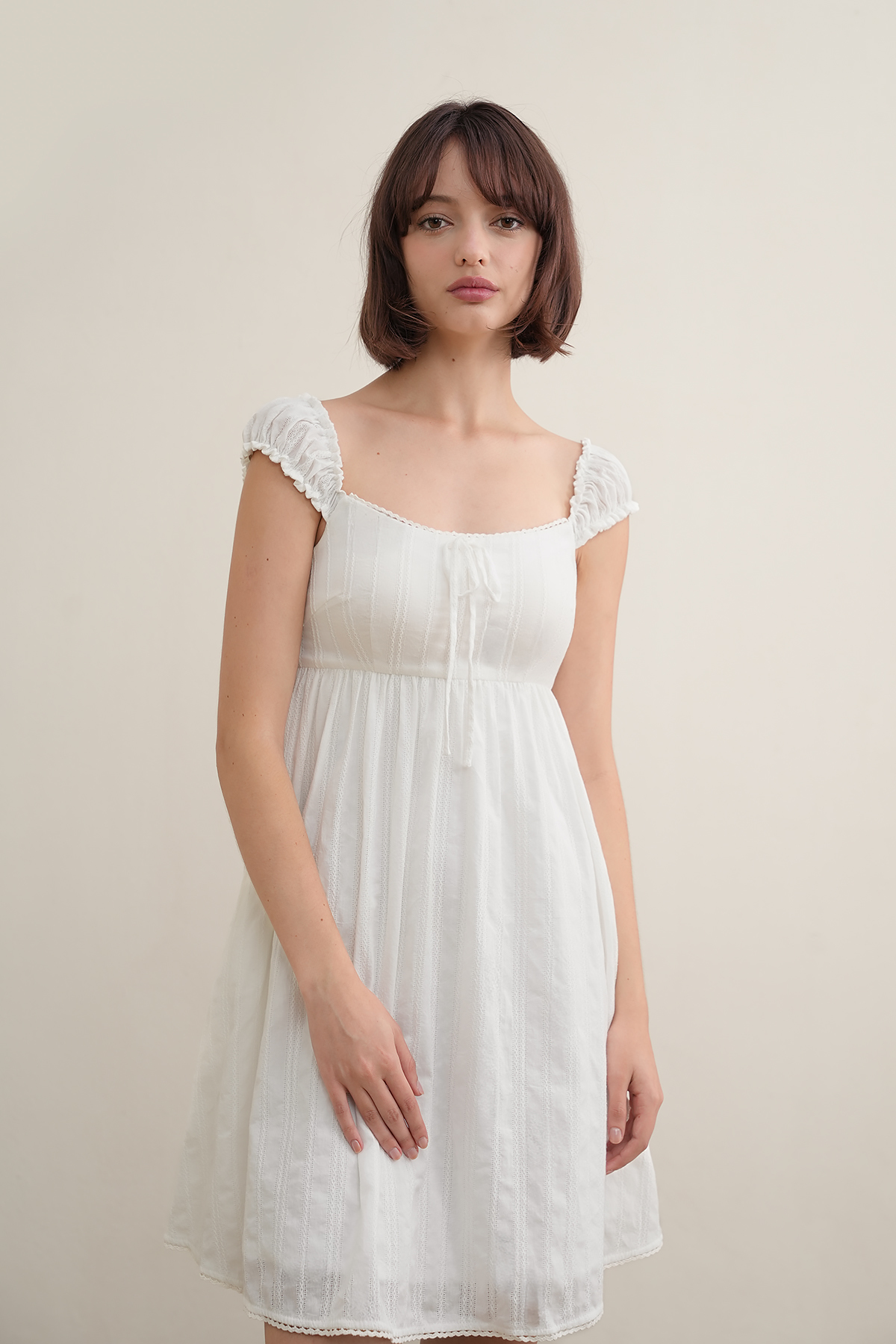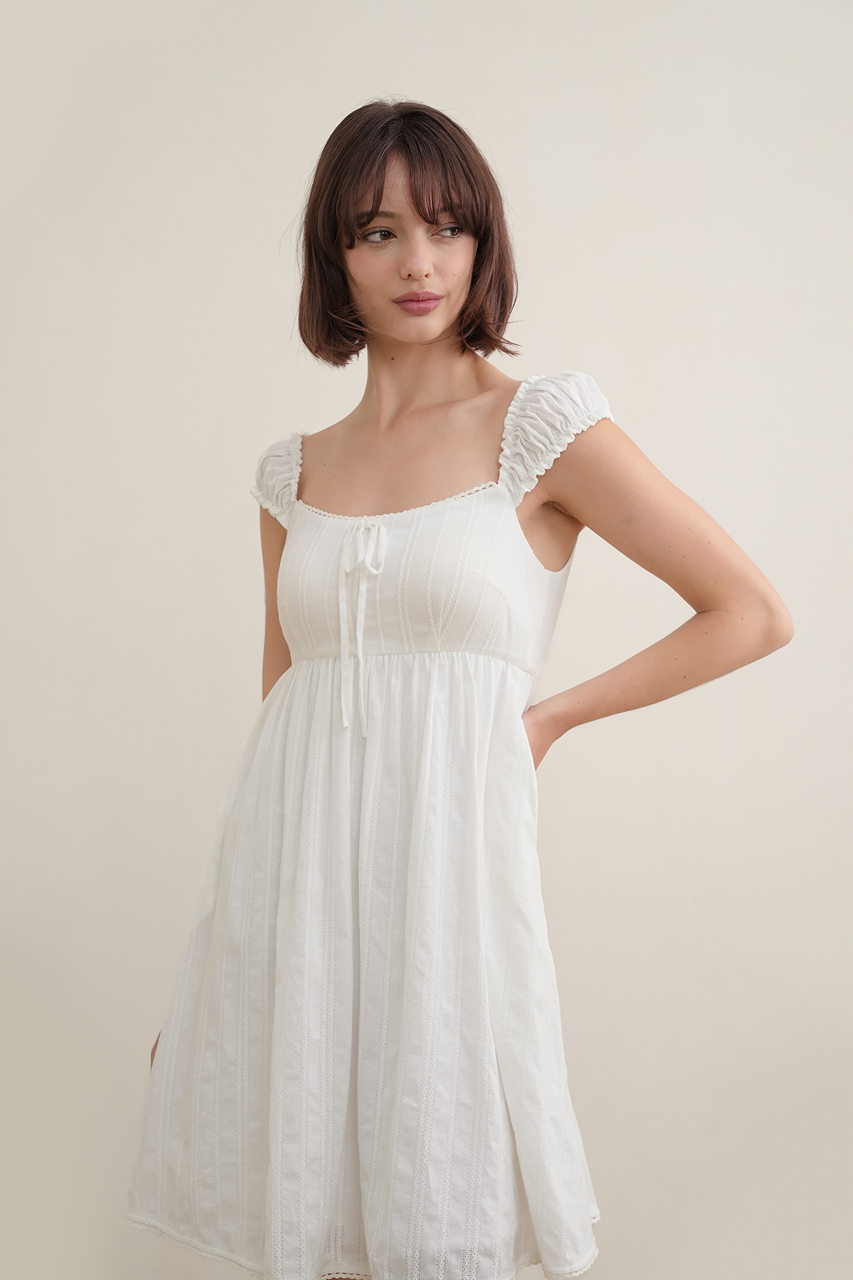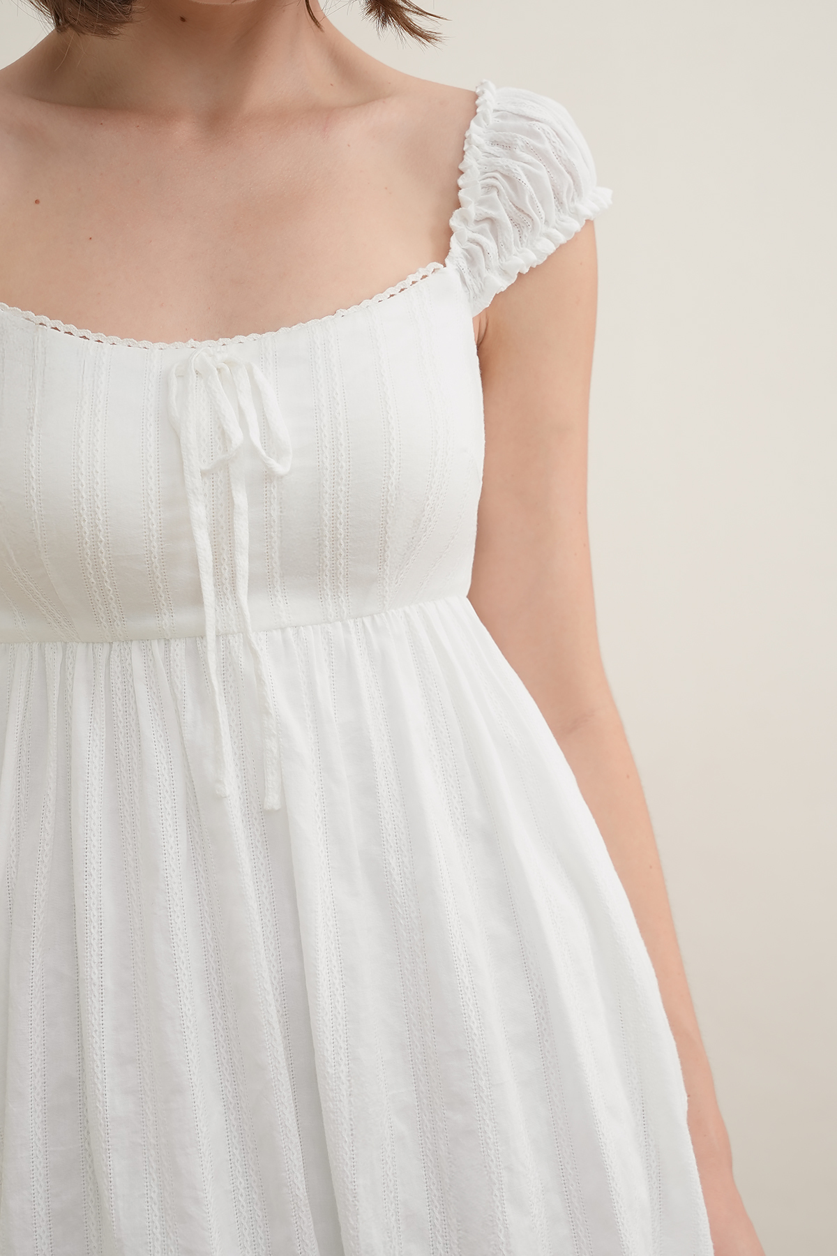 The Seraph Broderie Babydoll Dress is the epitome of sweet femininity. This babydoll dress brings the charm with broderie textures, softly gathered details, ruffled elastic sleeves, a sweet little bow and padded for ease—made for twirling through sunlit days and spontaneous plans.