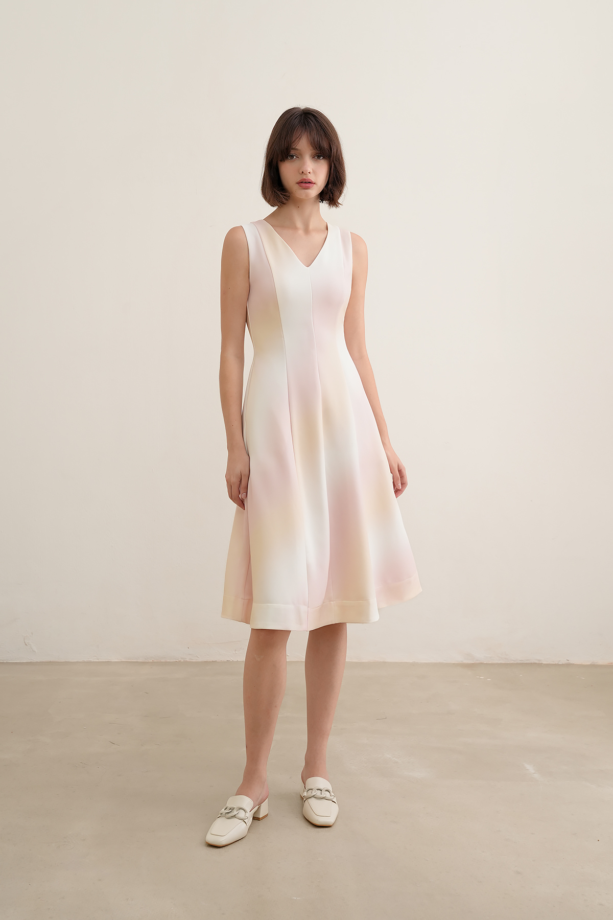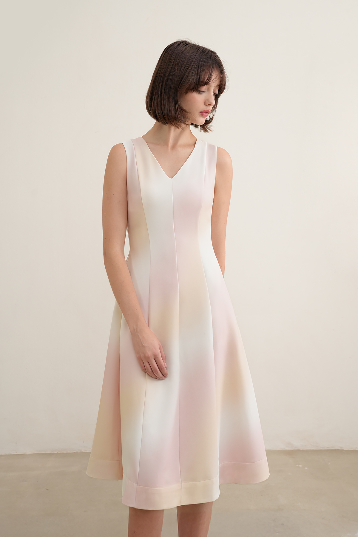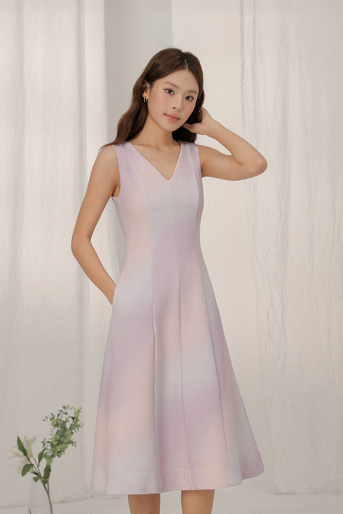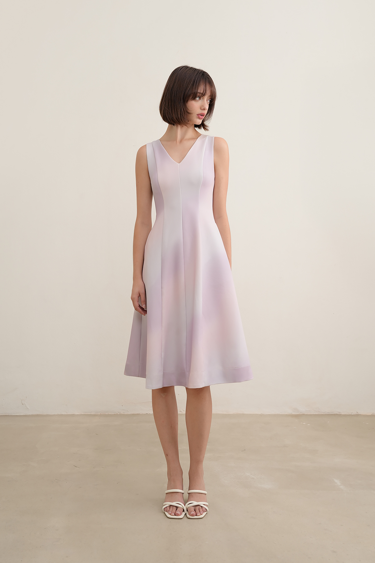 Soft skies, but make it wearable. This dreamy Daydream Panelled Midi Dress flows with every step, featuring a clean V-neckline, fit-and-flare silhouette, and pastel tones that feel like walking through a daydream.