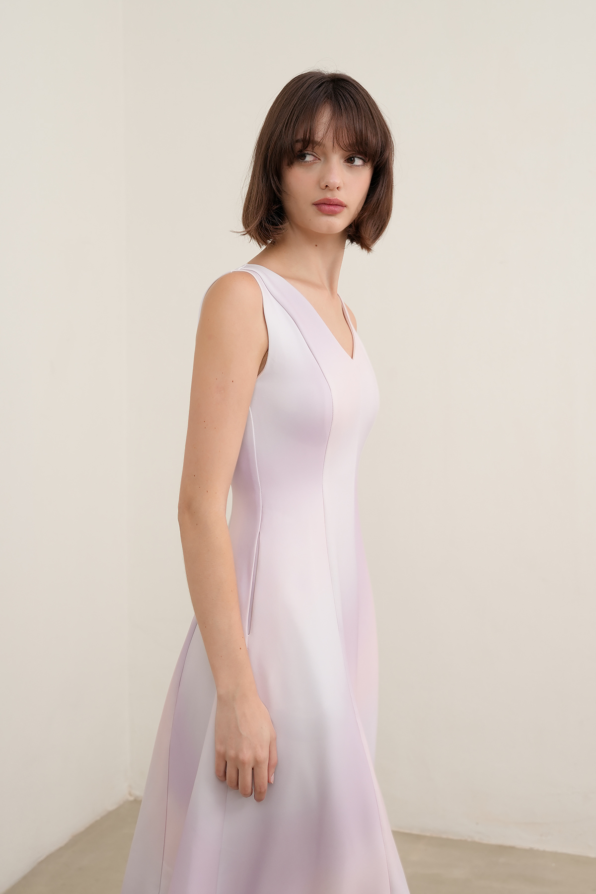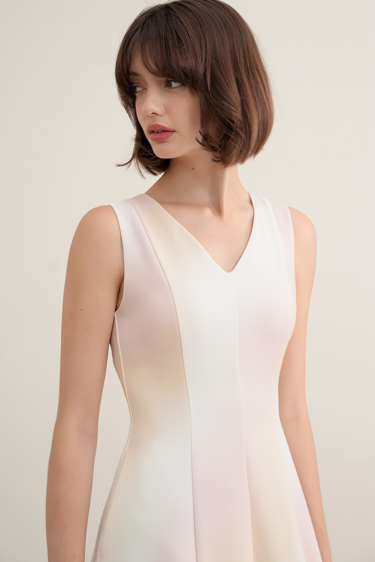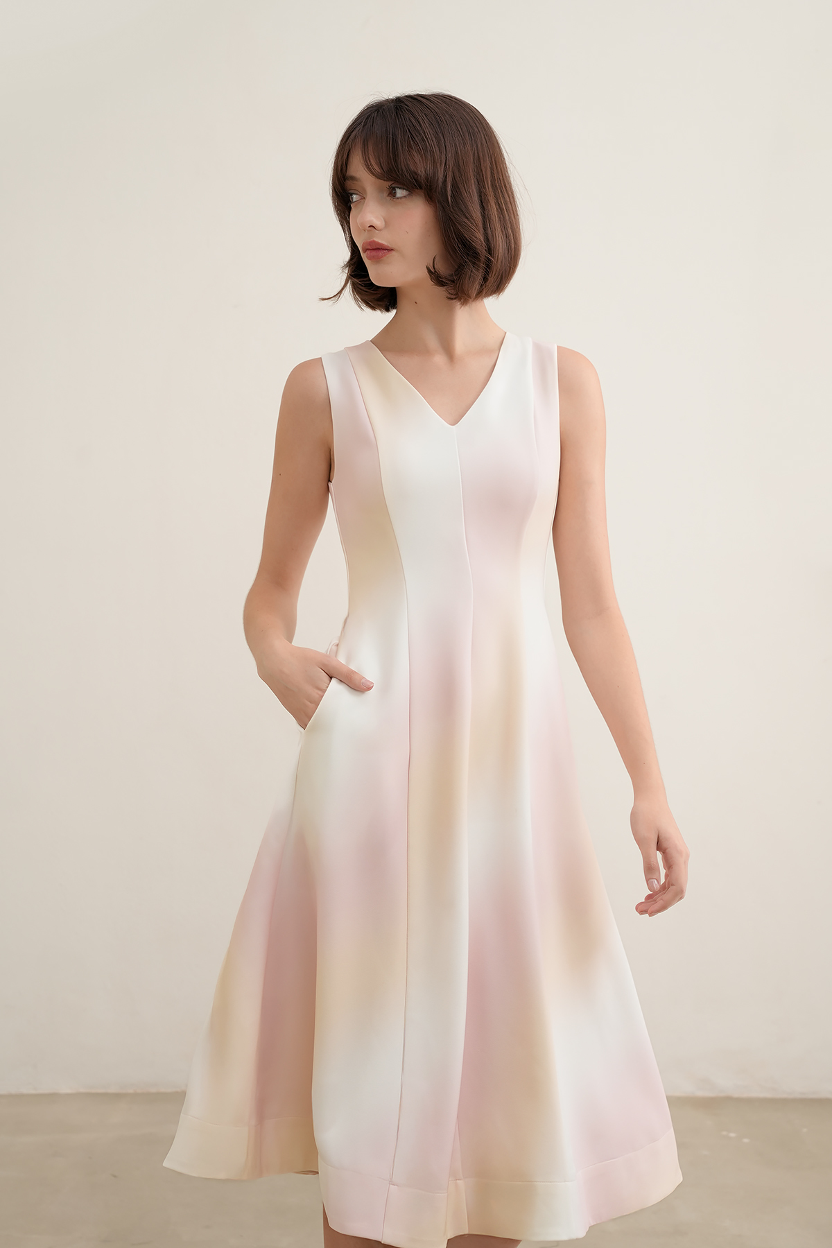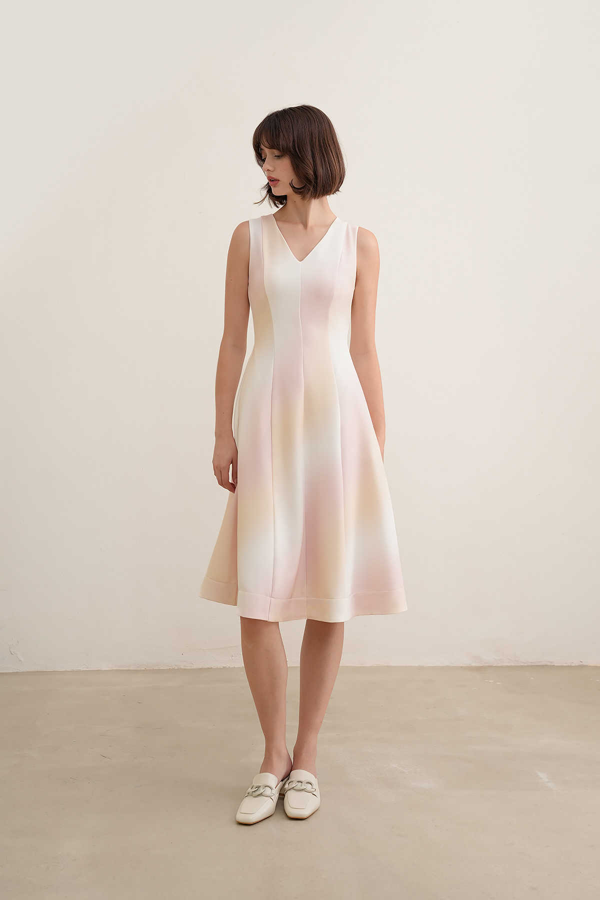 Soft skies, but make it wearable. This dreamy Daydream Panelled Midi Dress flows with every step, featuring a clean V-neckline, fit-and-flare silhouette, and pastel tones that feel like walking through a daydream.