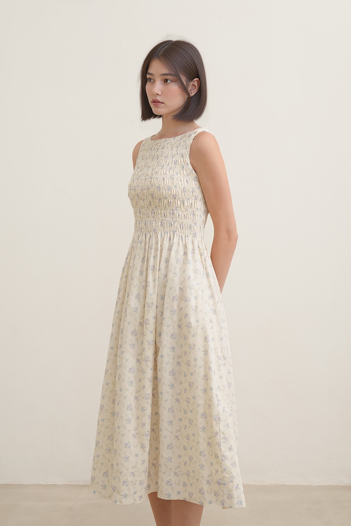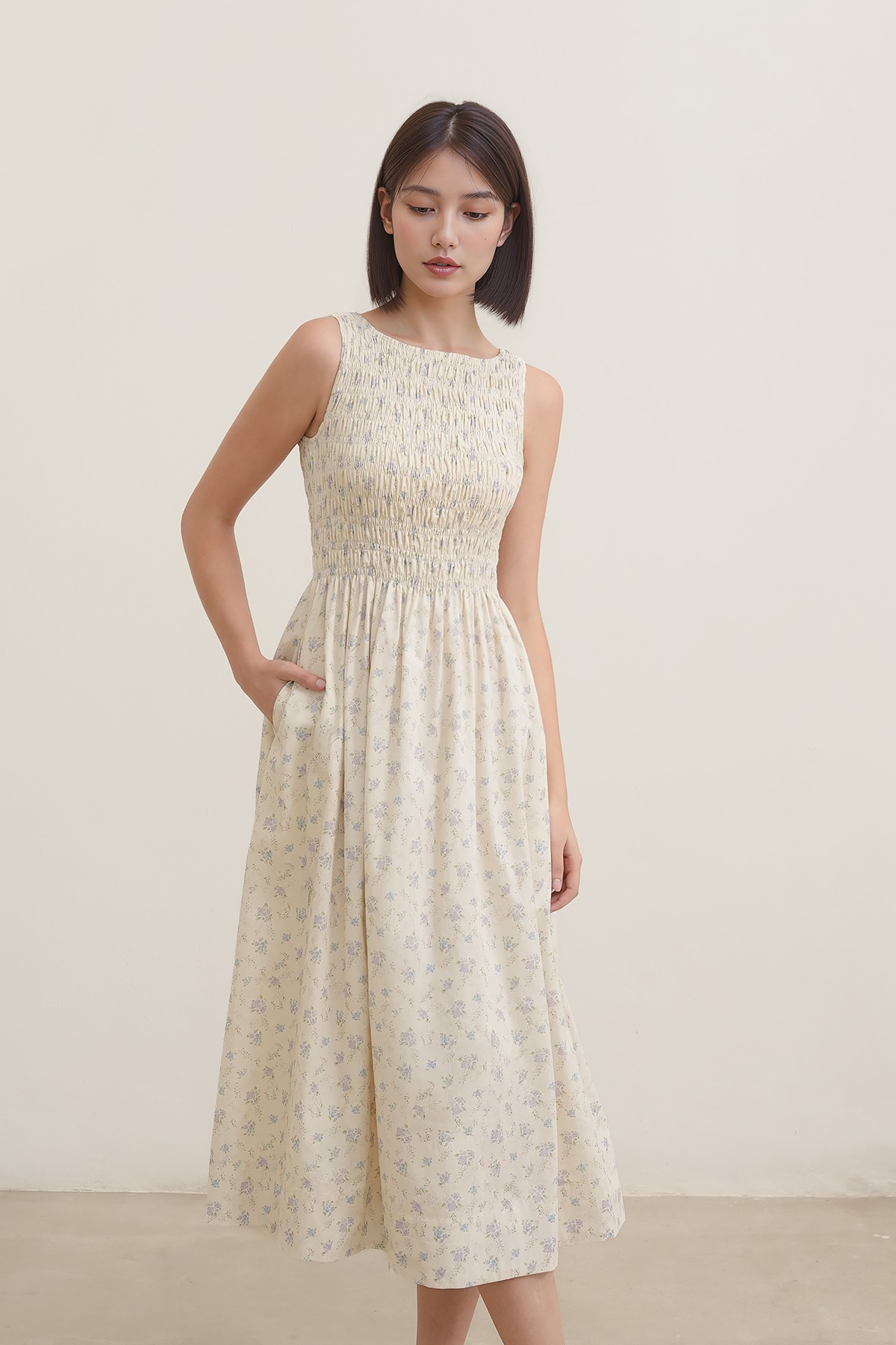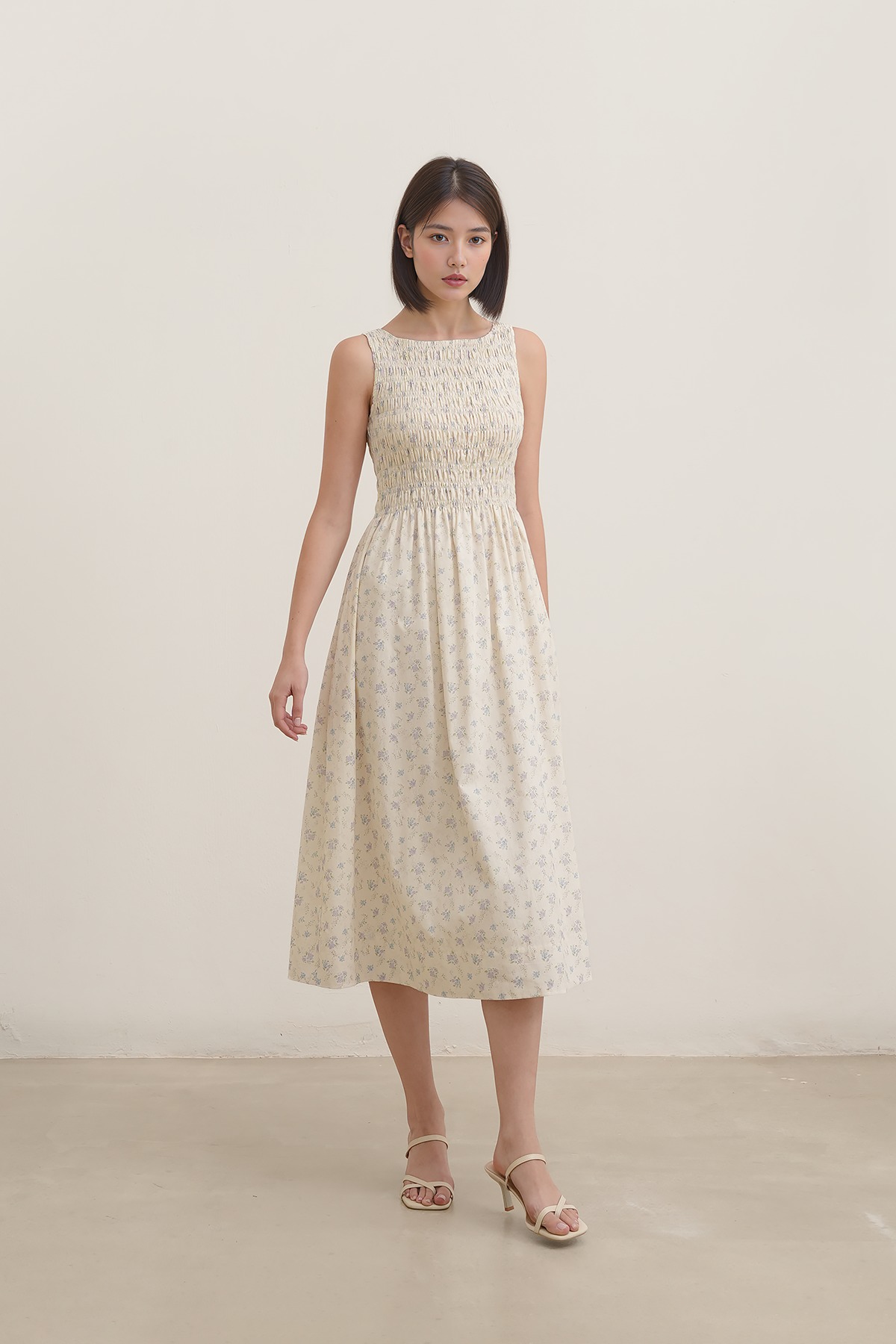 Soft, romantic, and effortlessly timeless. With dainty florals on a soft cotton base, a shirred bodice, and an easy midi length, this dress feels straight out of a sun-drenched daydream—perfect for barefoot brunches, golden hour walks, and slow living moments.