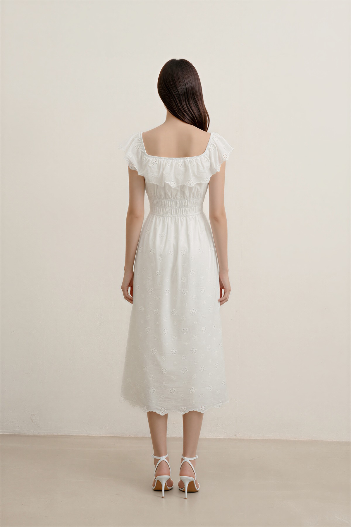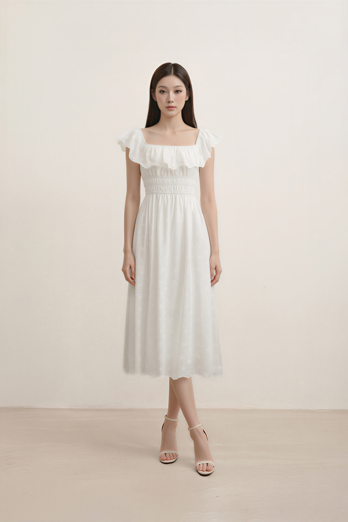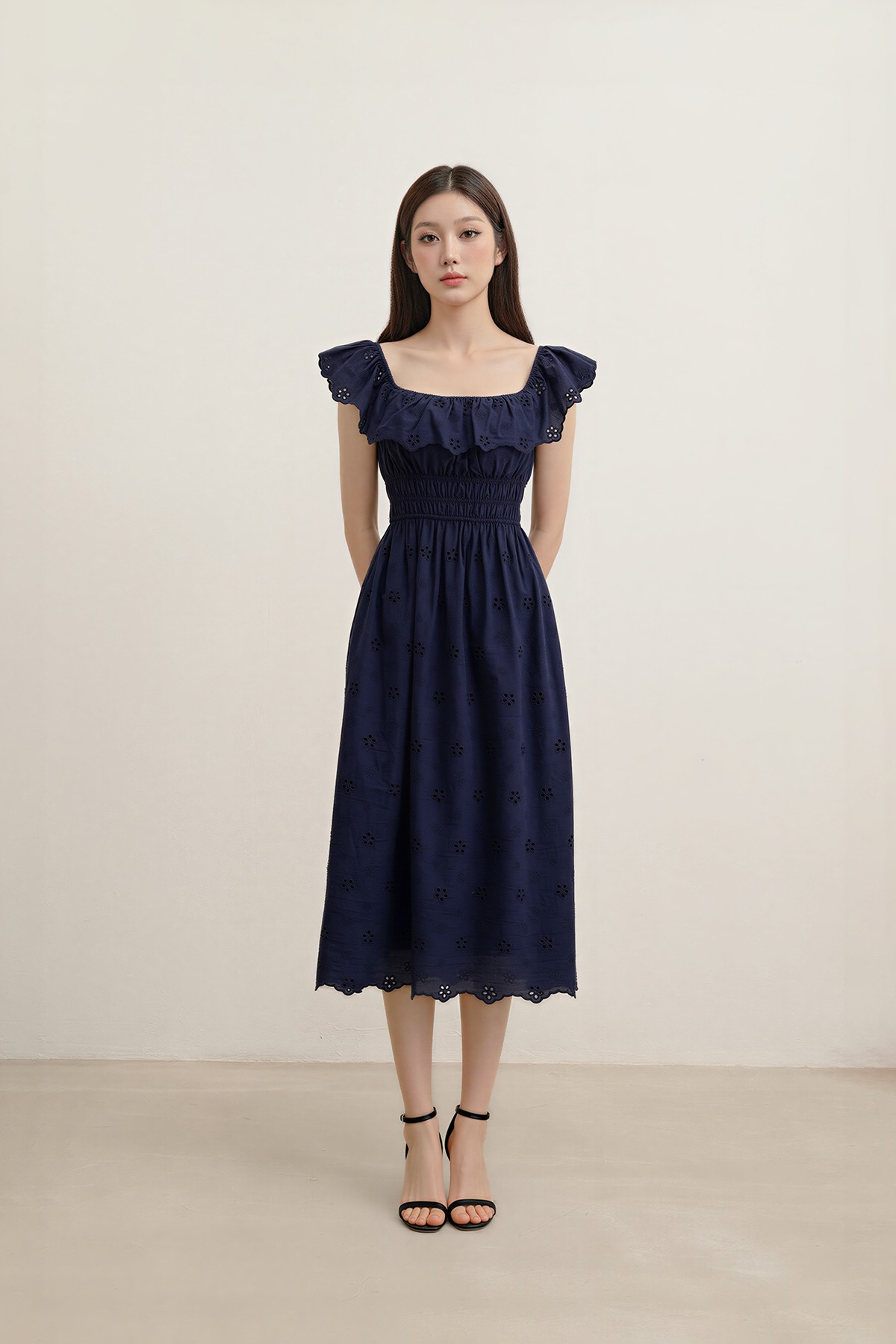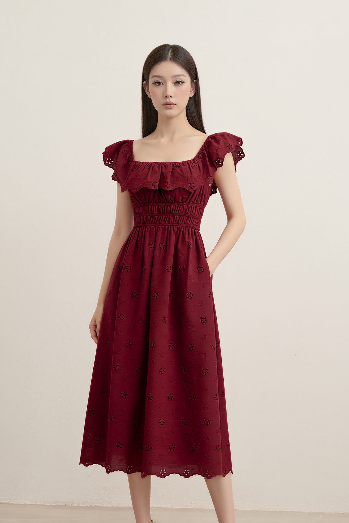 Romantic, dressy, and beautifully refined. The Verdine Padded Broderie Ruffle Midi Dress features a charming square ruffle neckline, a flattering shirred waist, and—yes—side pockets. Finished with delicate broderie details, it’s made for garden soirées, dinner dates, and all things pretty.