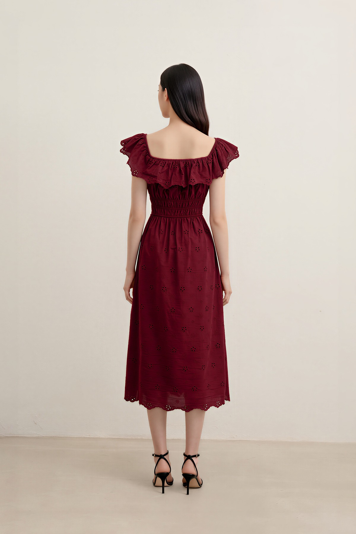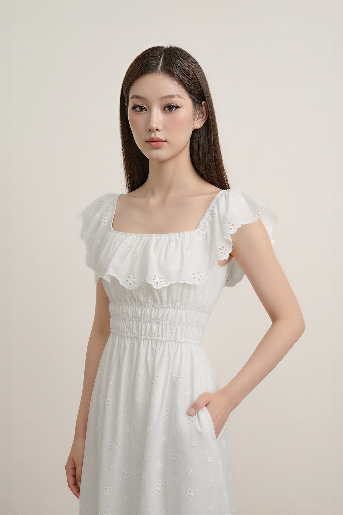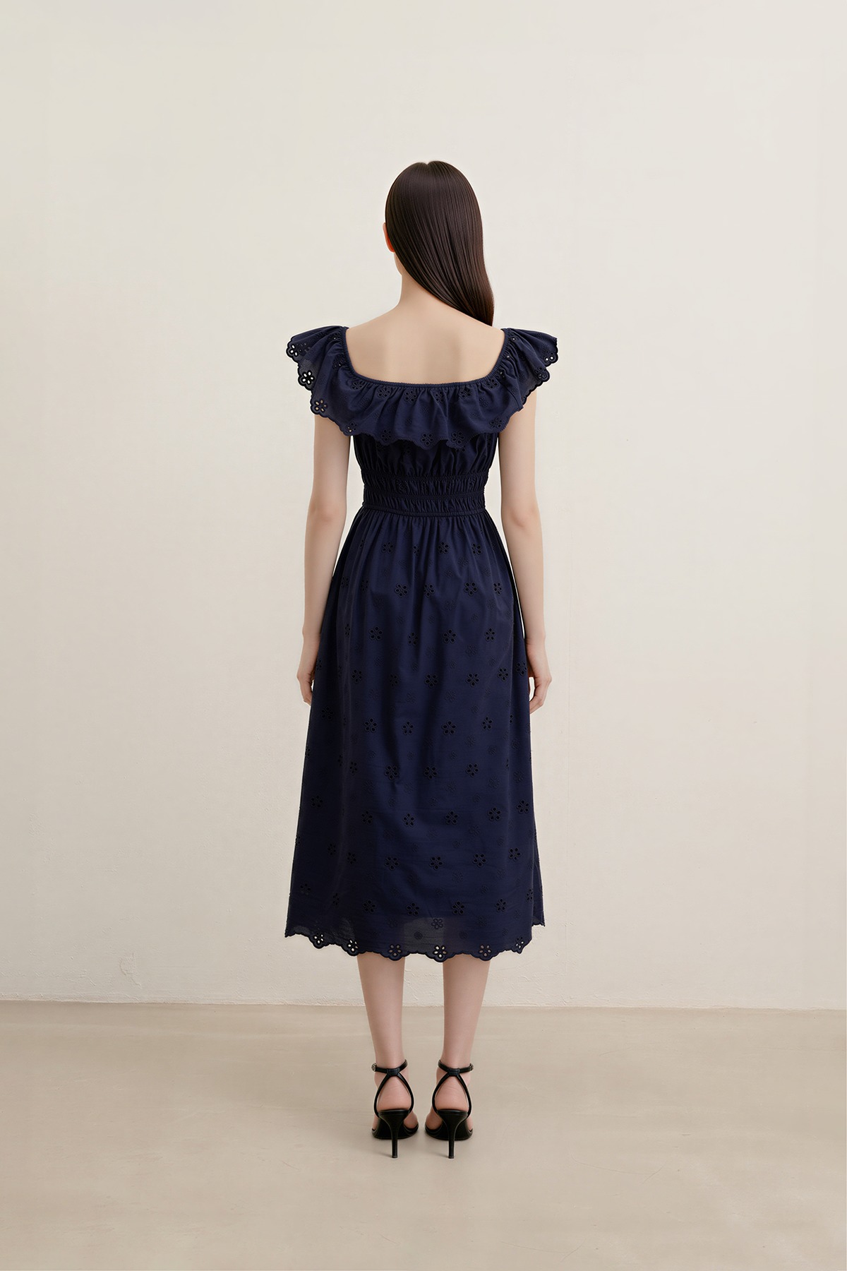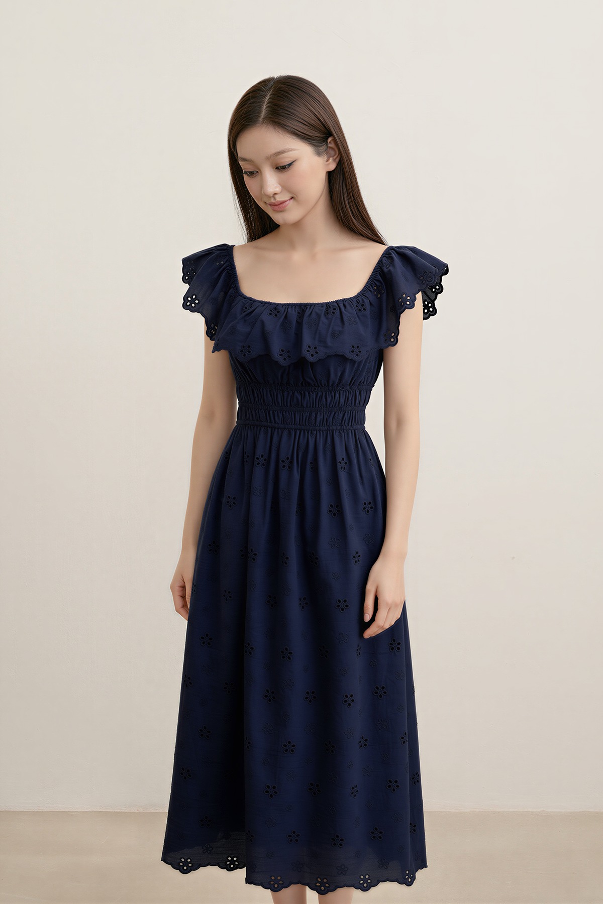 Romantic, dressy, and beautifully refined. The Verdine Padded Broderie Ruffle Midi Dress features a charming square ruffle neckline, a flattering shirred waist, and—yes—side pockets. Finished with delicate broderie details, it’s made for garden soirées, dinner dates, and all things pretty.