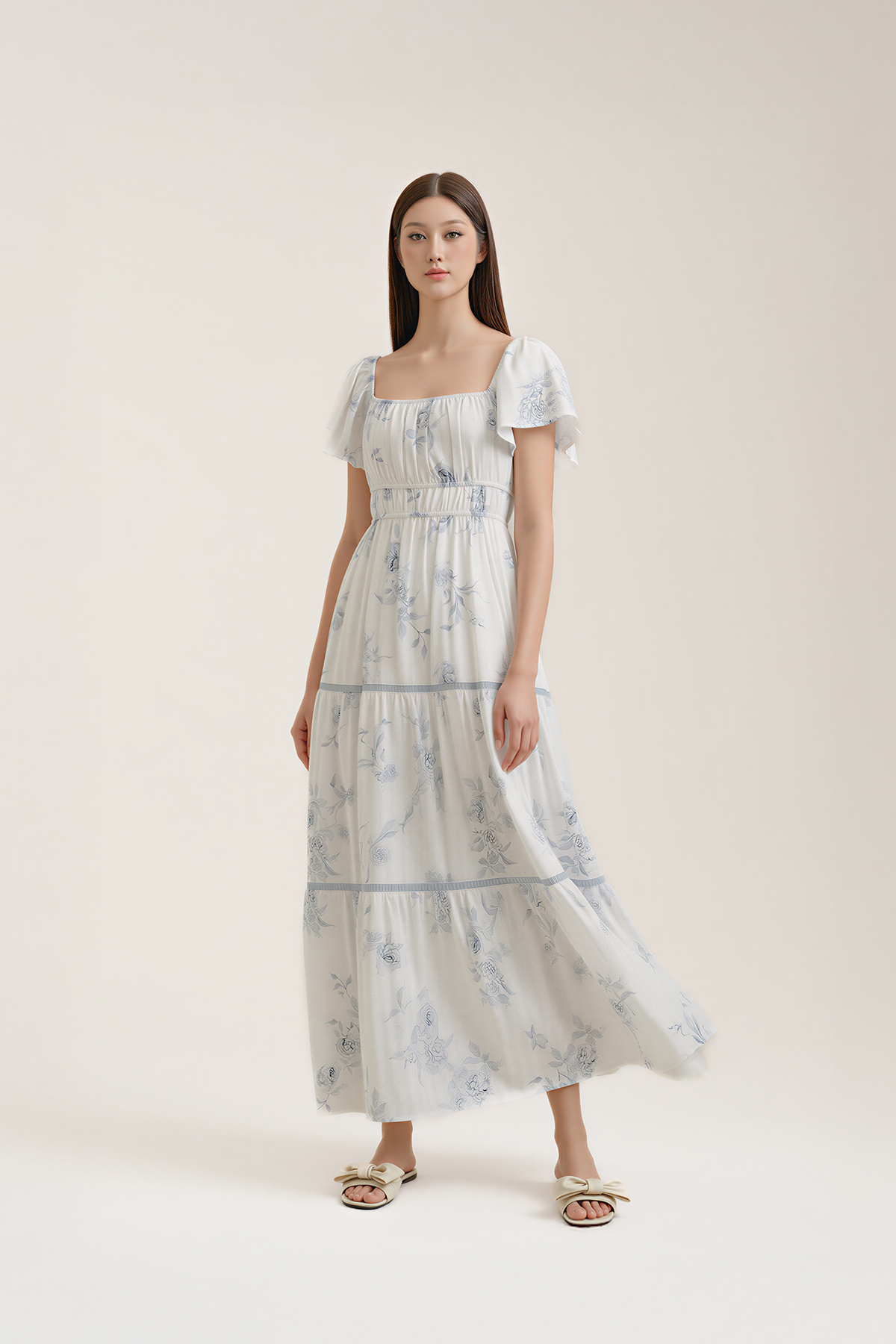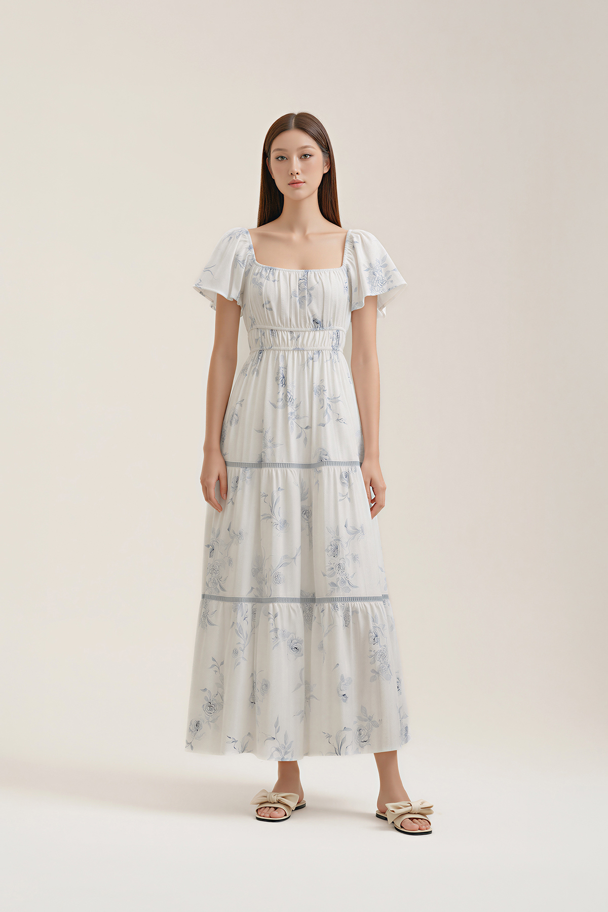 Sweet, feminine, and effortlessly wearable. Featuring flutter sleeves, a softly shirred waist, and tiered maxi length, this Château Flutter Sleeve Dres blends comfort and polish—easy to wear, easy to love.