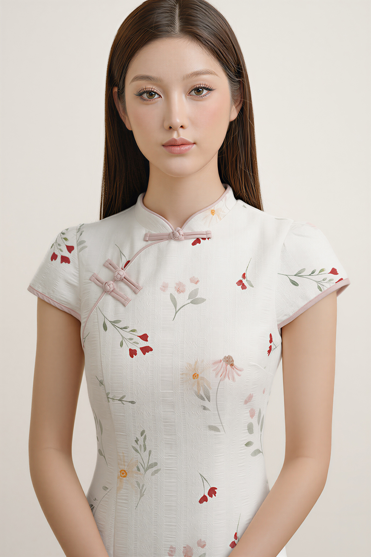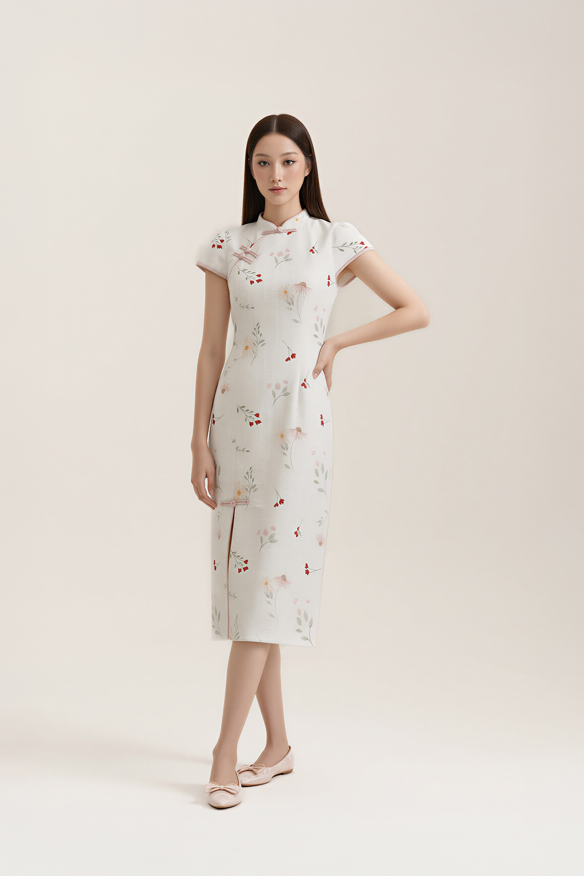 Elegant, timeless, and beautifully considered. Featuring classic knot buttons, a graceful front slit, and a textured, structured fit, this cheongsam is designed to flatter with ease—refined lines in textured cotton, made for moments that call for quiet sophistication.