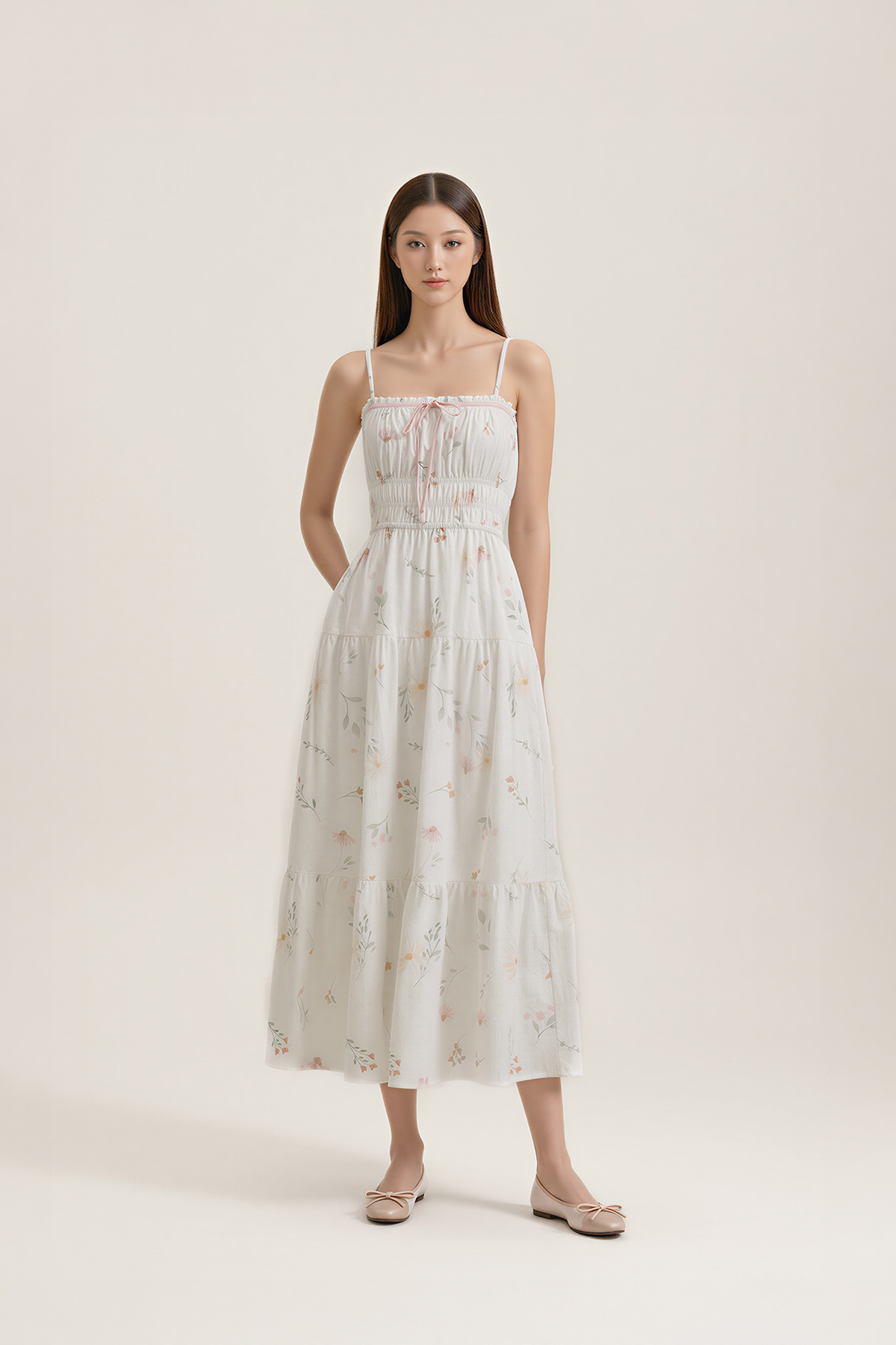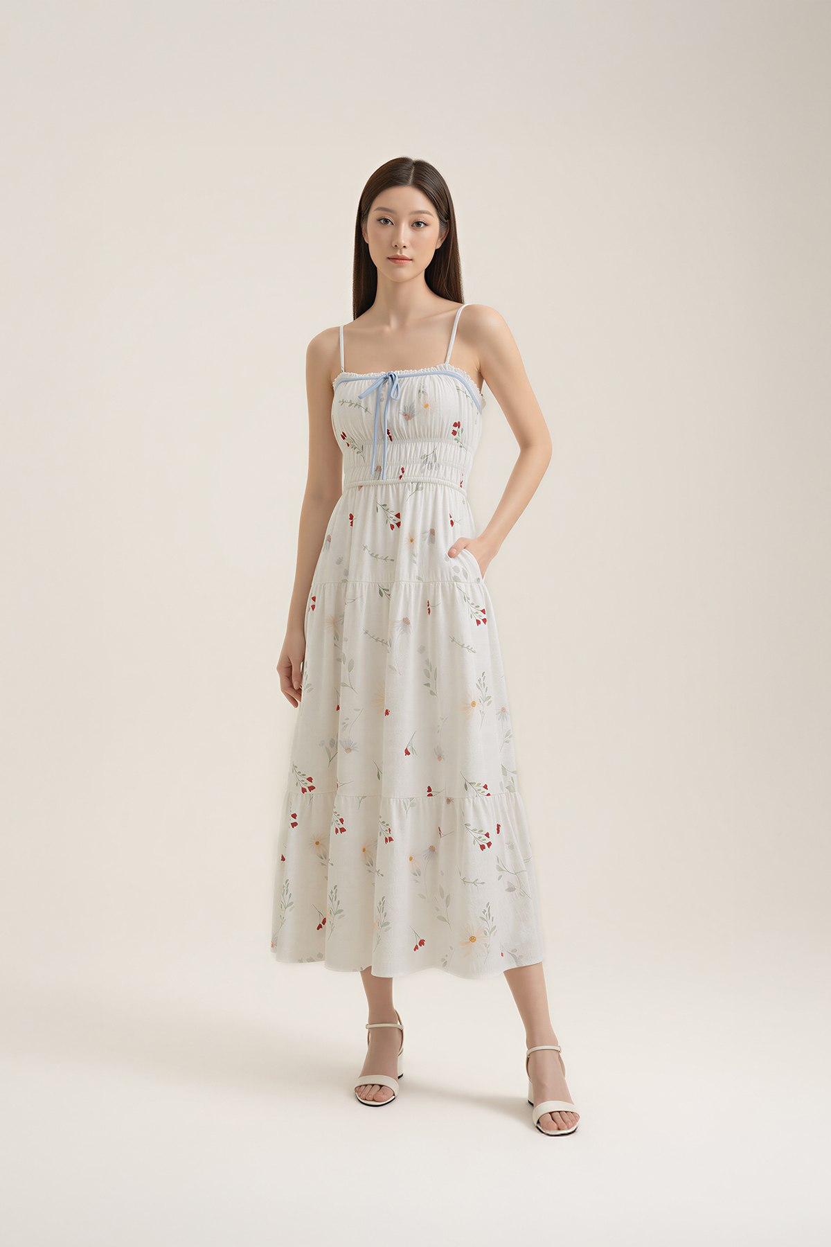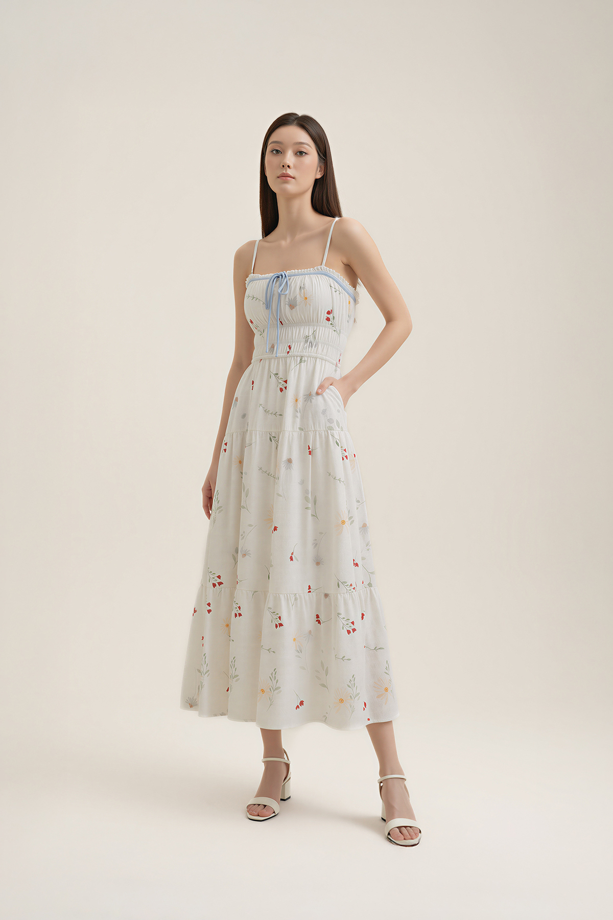 Soft, feminine, and effortlessly wearable. Designed in lightly textured floral cotton with a gently shirred waist, tiered midi length, and side pockets, this Poem Padded Summer Midaxi Dress is finished with a ribbon tie at the neckline and removable padding for easy comfort.