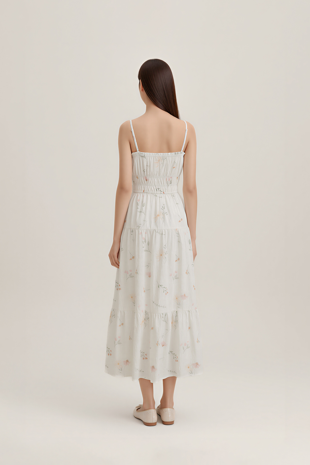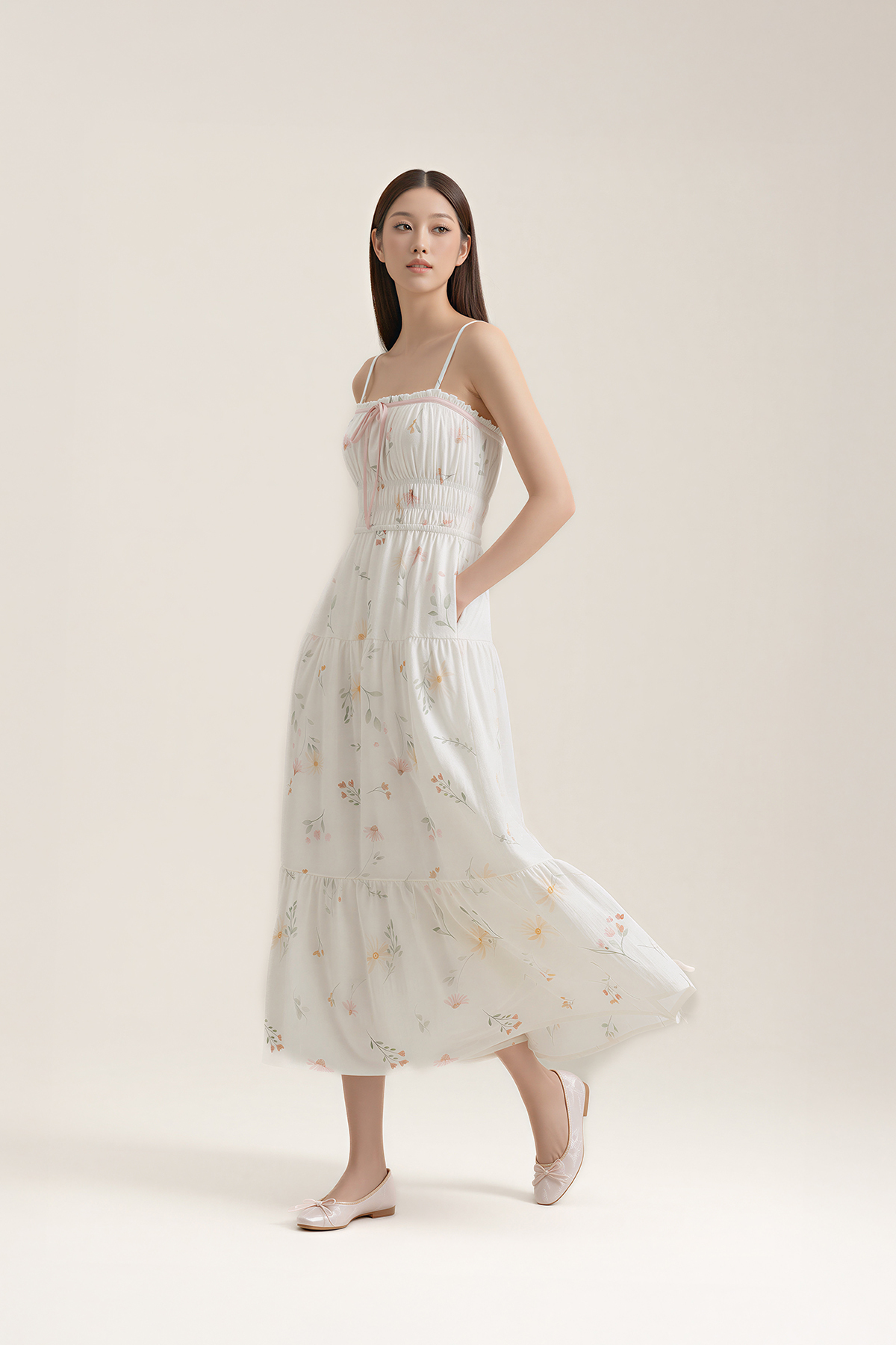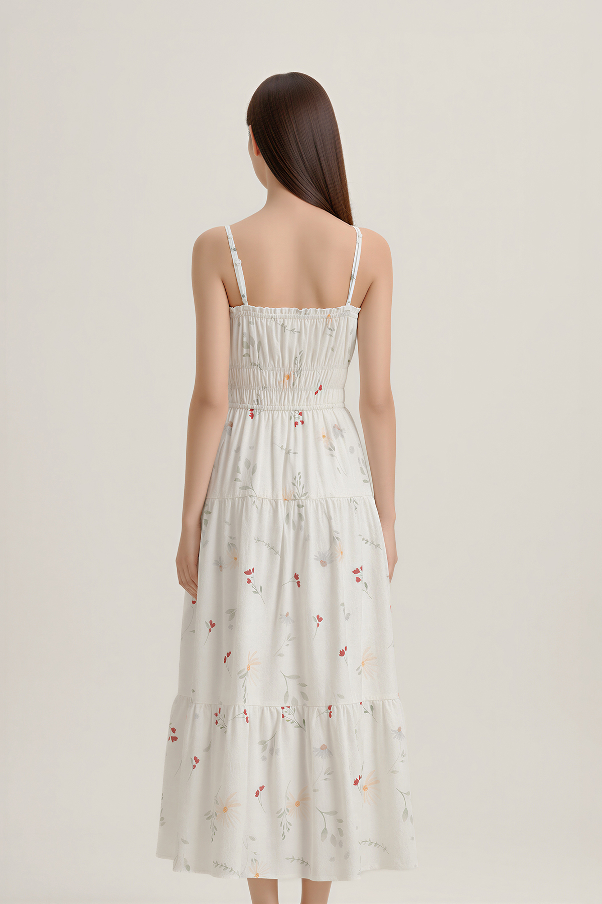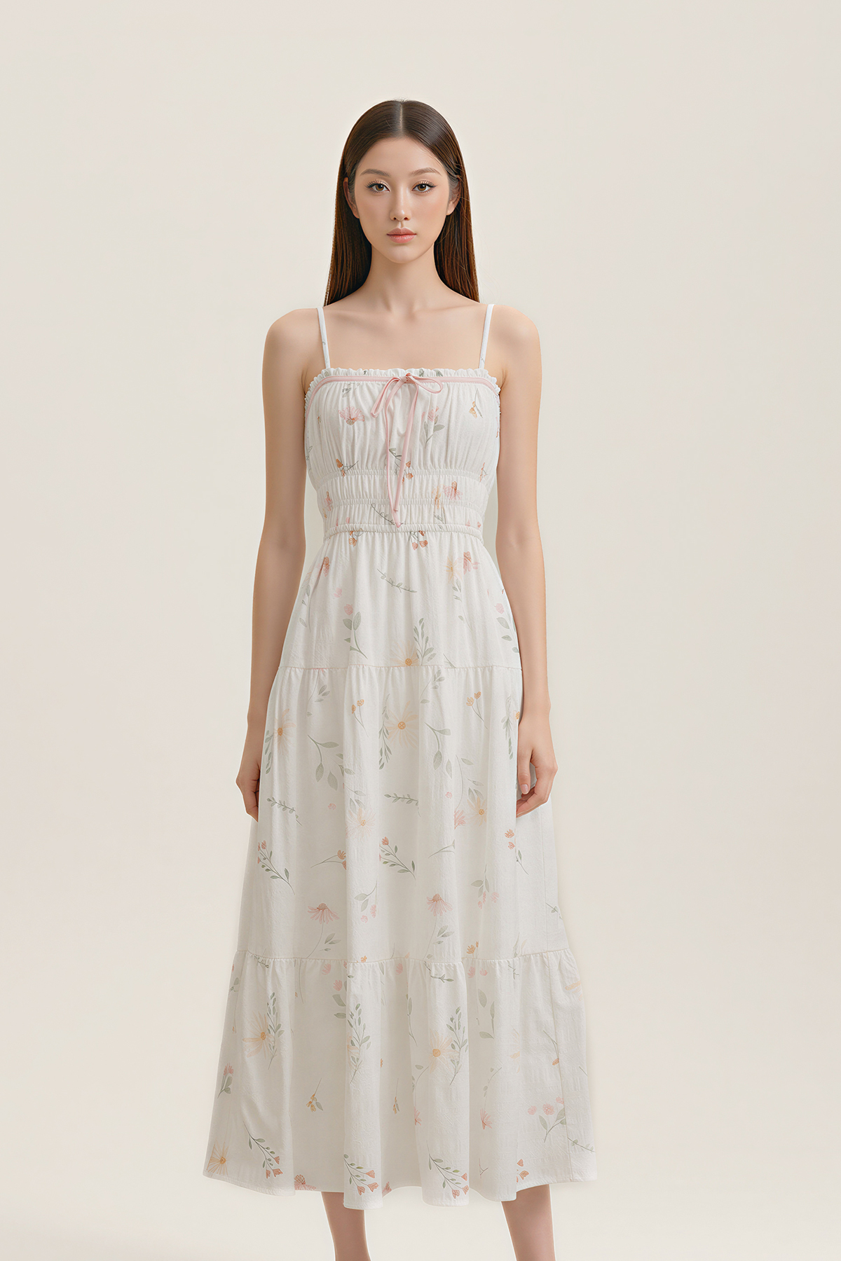 Soft, feminine, and effortlessly wearable. Designed in lightly textured floral cotton with a gently shirred waist, tiered midi length, and side pockets, this Poem Padded Summer Midaxi Dress is finished with a ribbon tie at the neckline and removable padding for easy comfort.