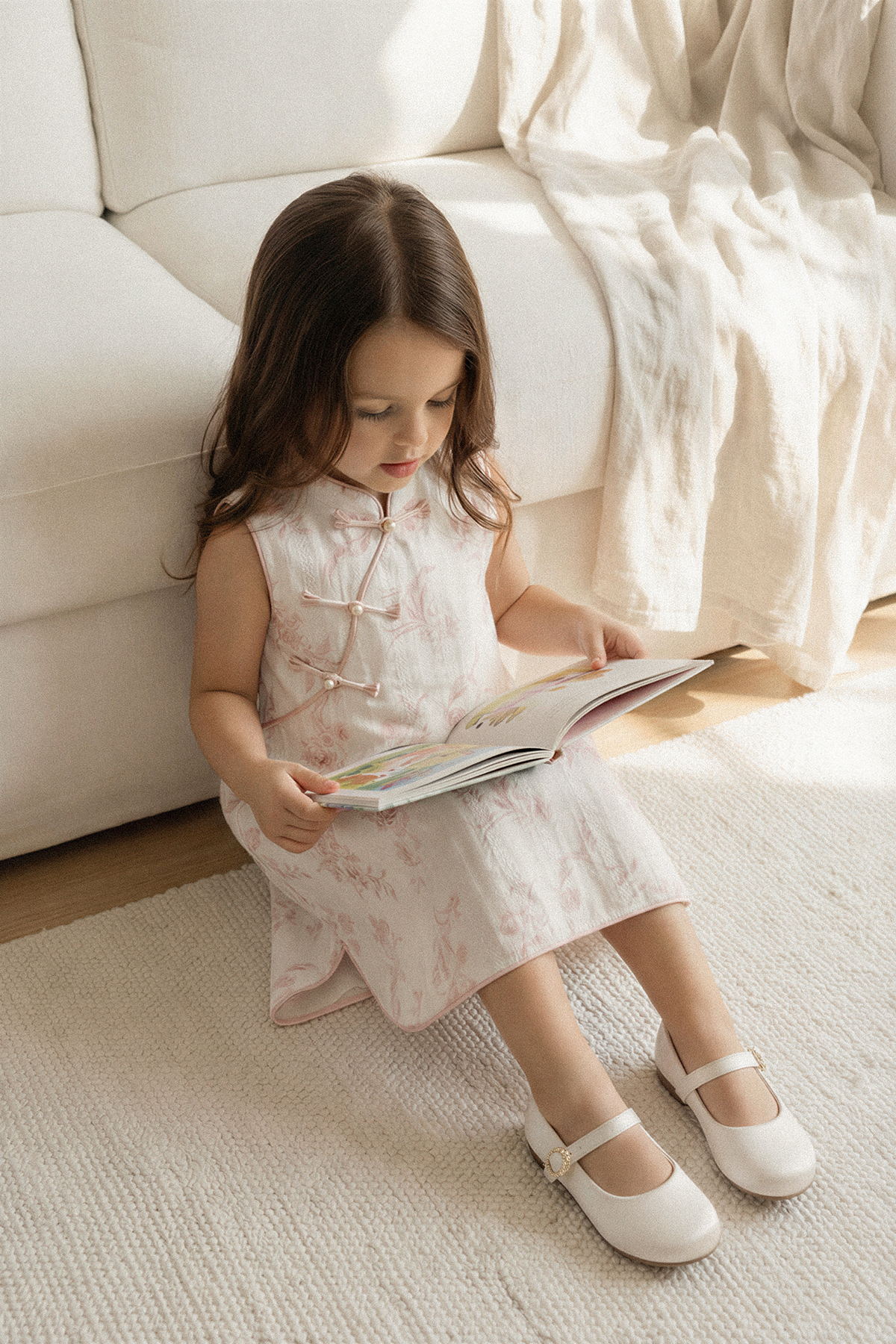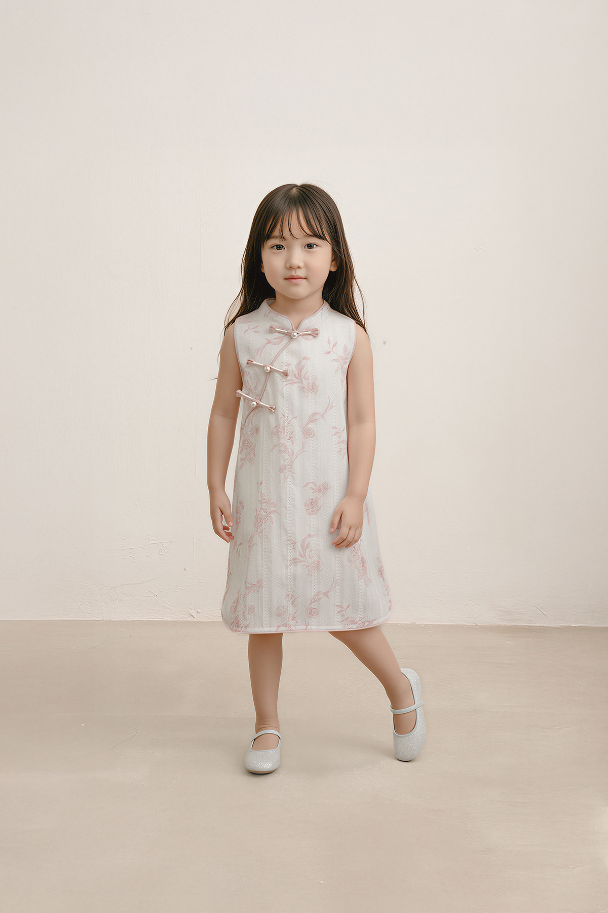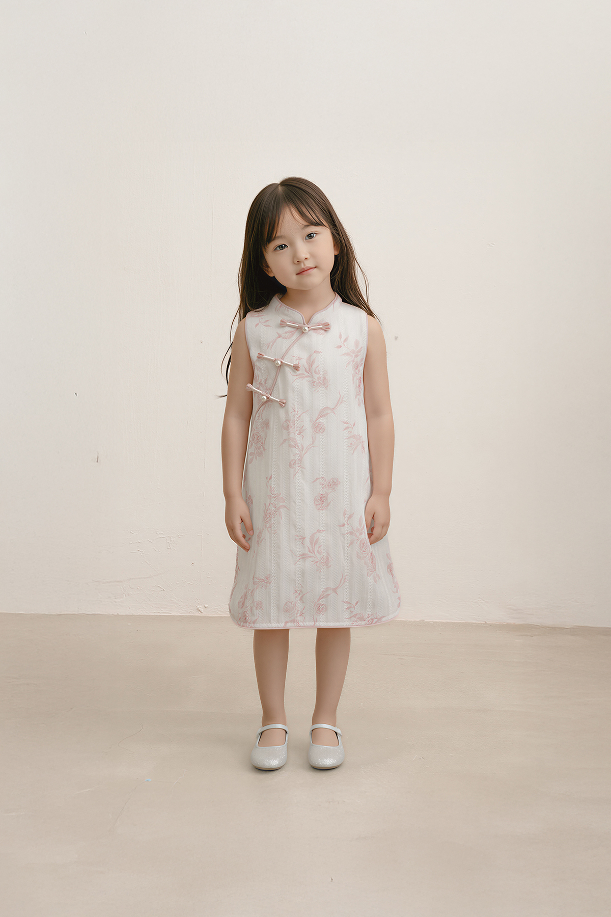 Sweet, classic, and celebration-ready. Designed with a sleeveless cut and pearl knot buttons, this cheongsam keeps little ones comfortable while looking effortlessly put together.