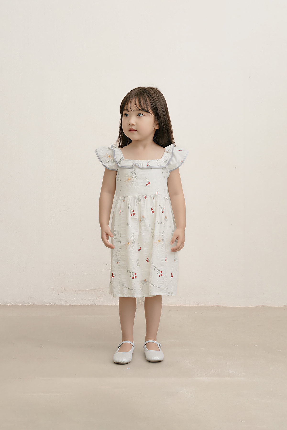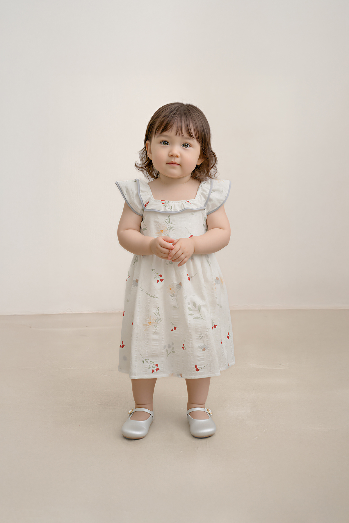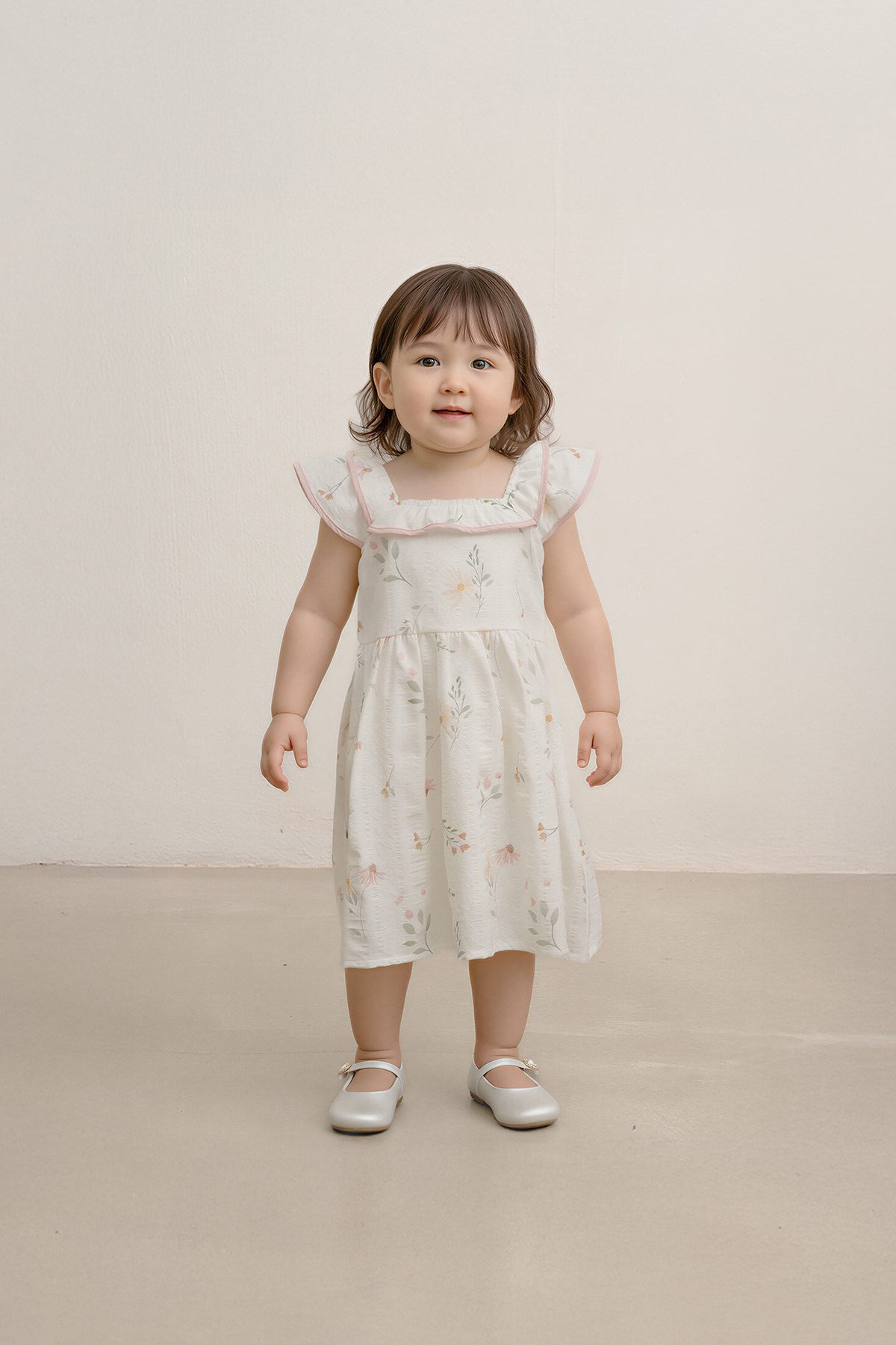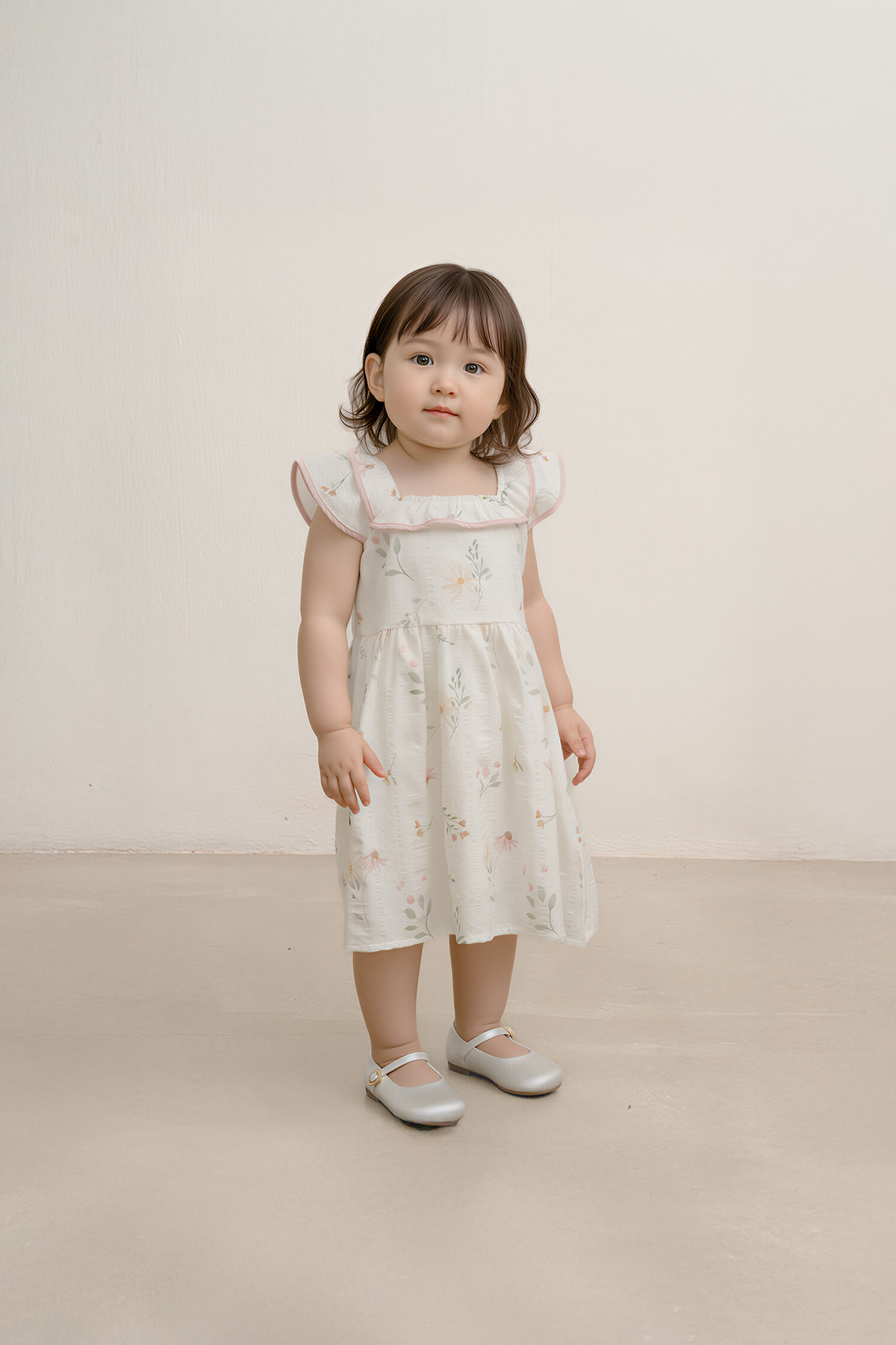 Soft, playful, and made for twirling. Designed with a ruffled neckline and a relaxed babydoll fit, this dress is light, comfy, and effortlessly charming—ideal for family twinning days.