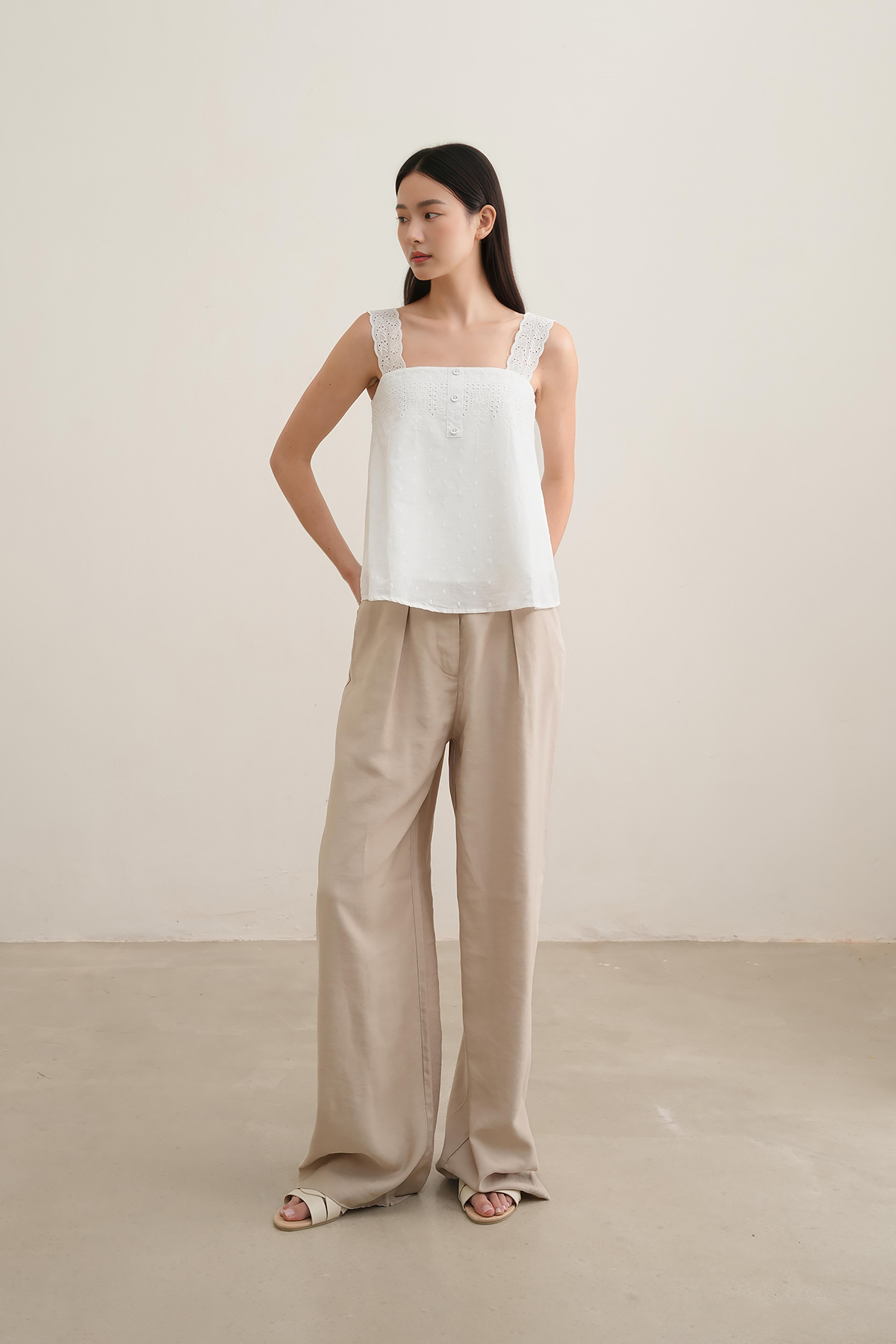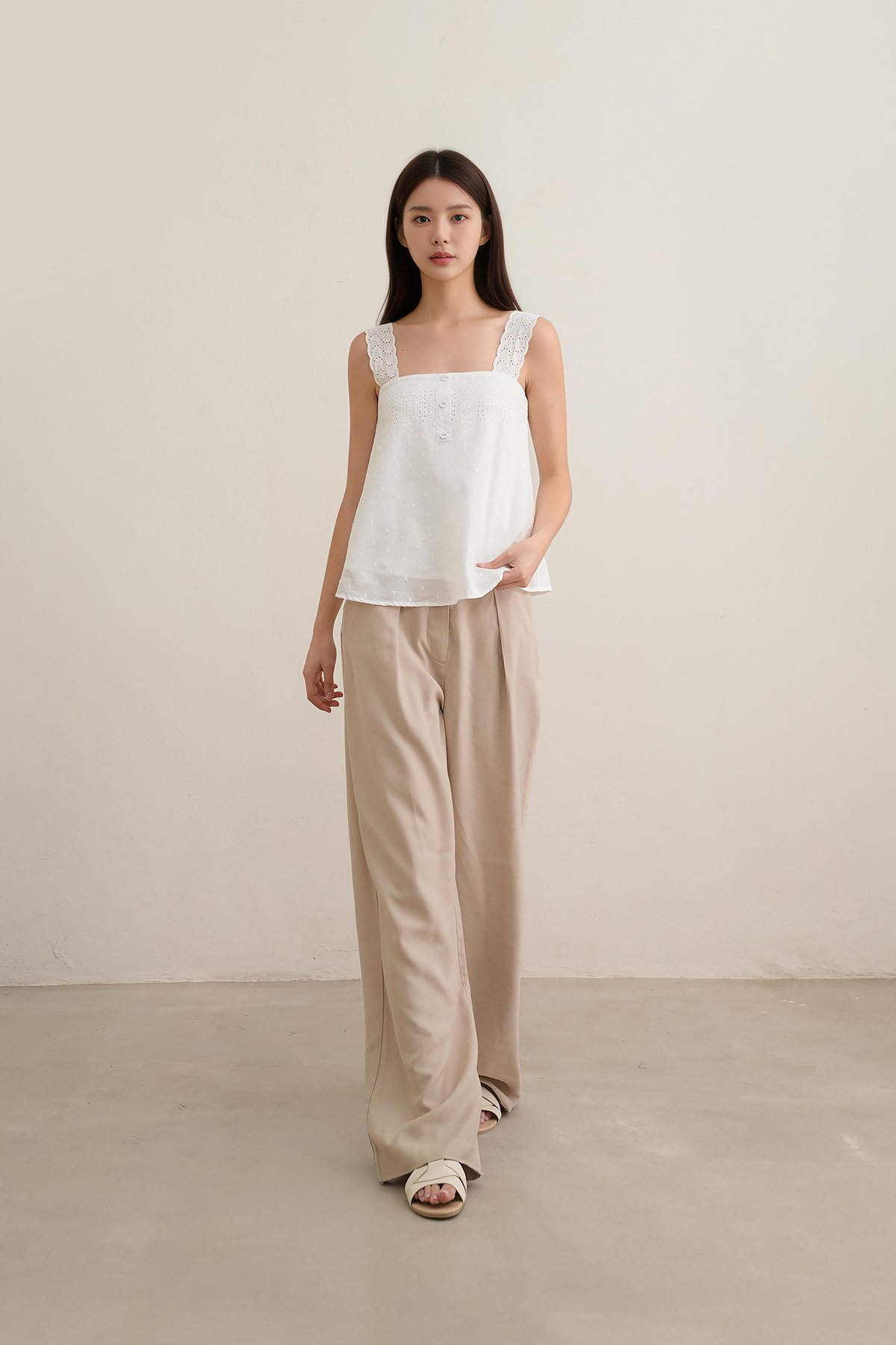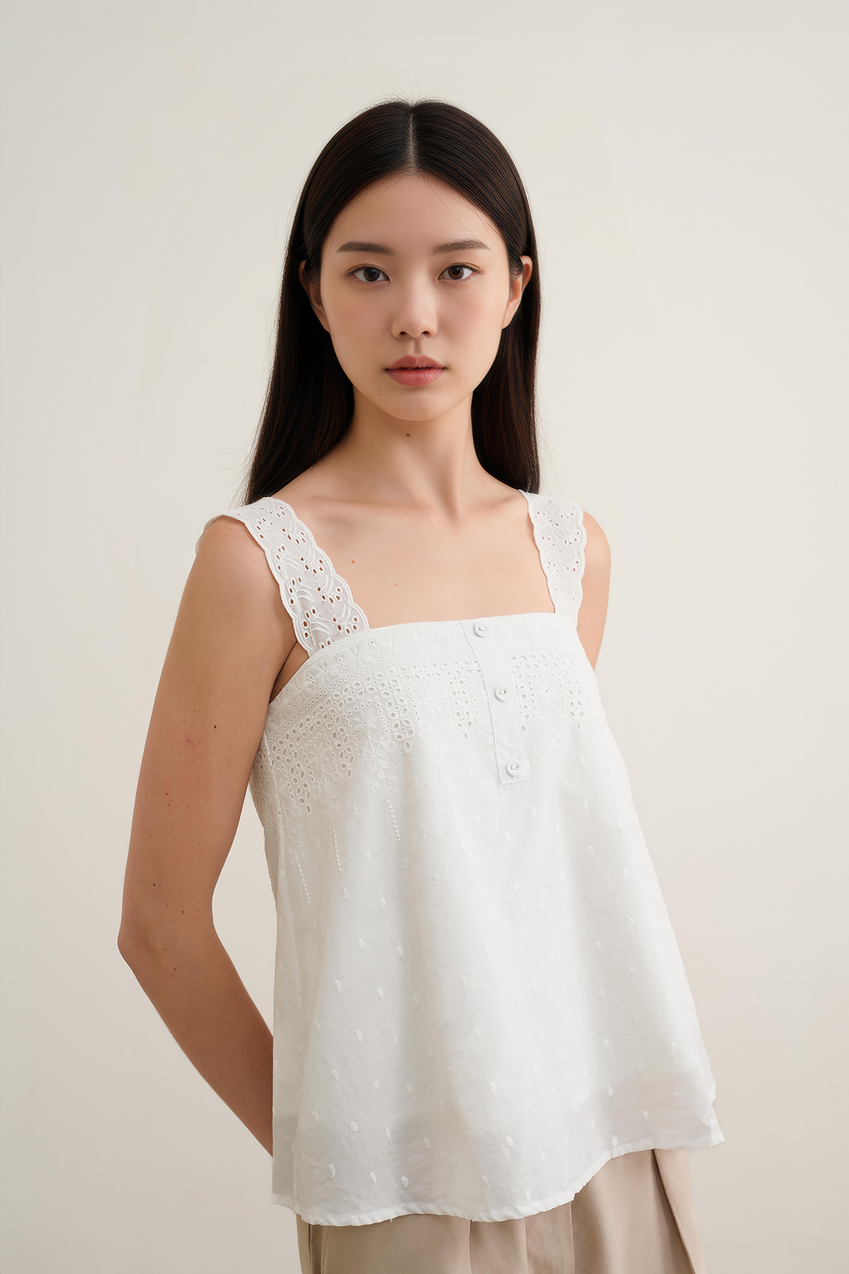 Meet your new fave broderie top—scallop straps, dainty buttons, and all the charm you need for an effortlessly sweet look.