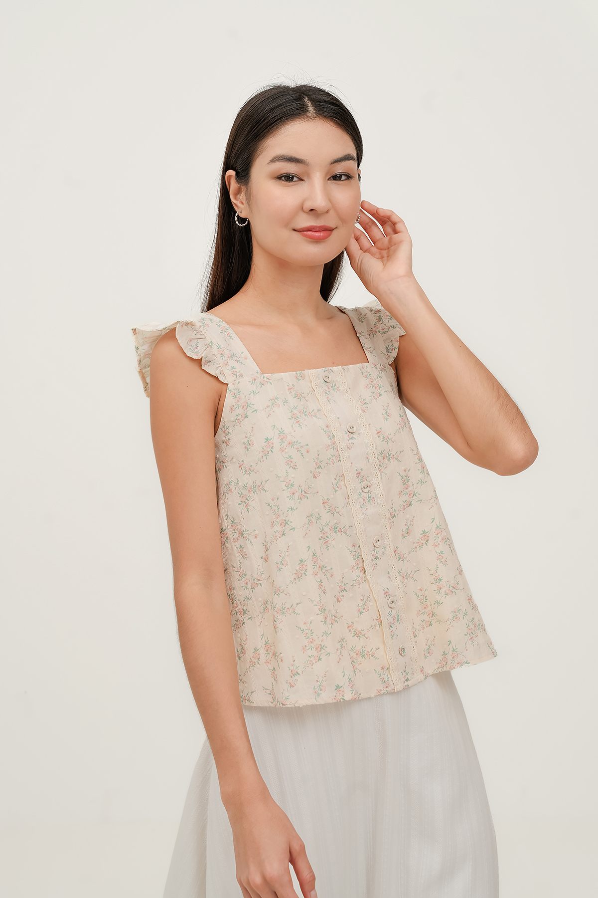 Soft florals meet fluttery sleeves and textured fabric—this top is a dreamy mix of cute and casual.