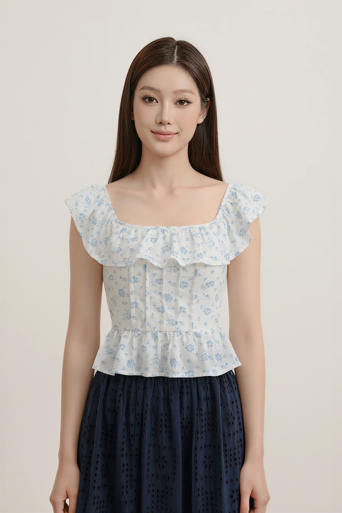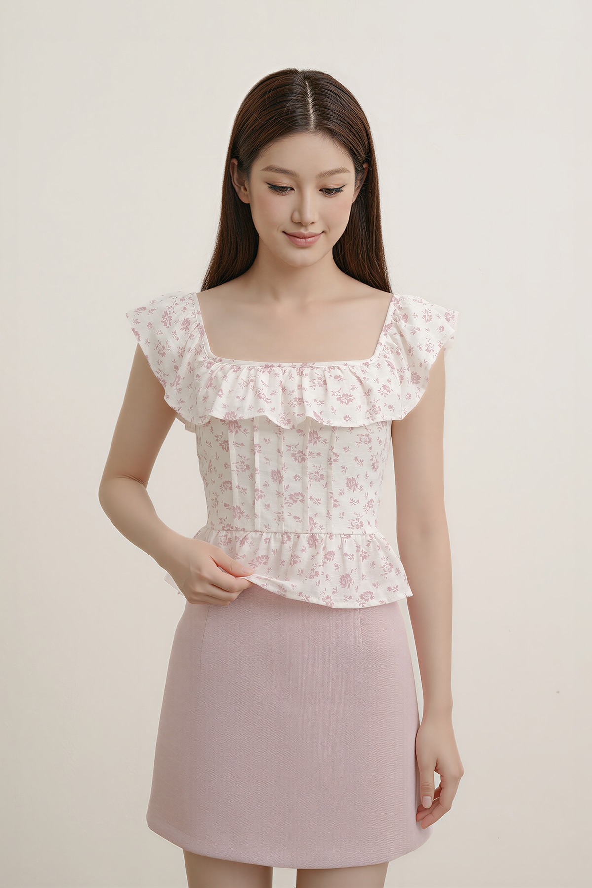 Softly romantic with an easy, feminine charm. The Petale Padded Floral Ruffle Top is crafted from a textured, linen-like floral fabric with a charming square ruffle neckline and a soft peplum hem—perfect for sunlit days, leisurely brunches, and easy, romantic dressing.