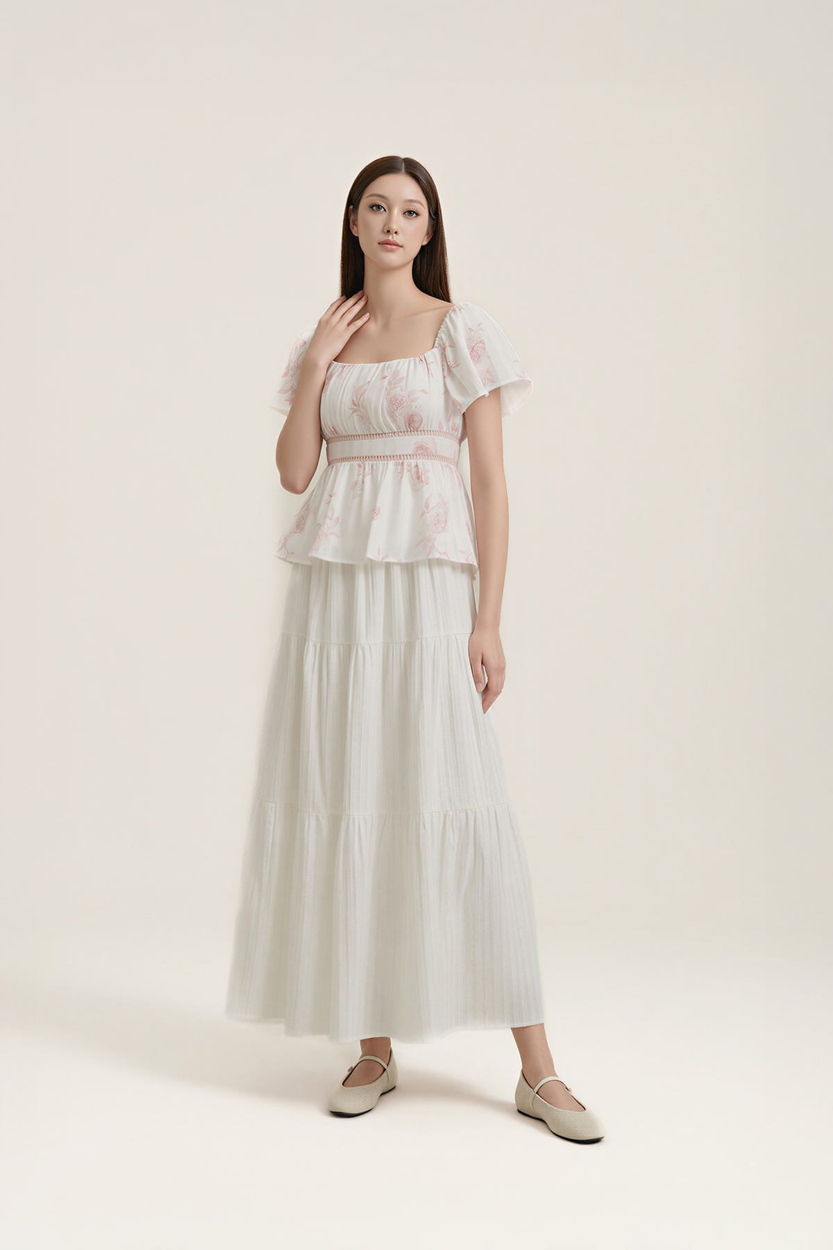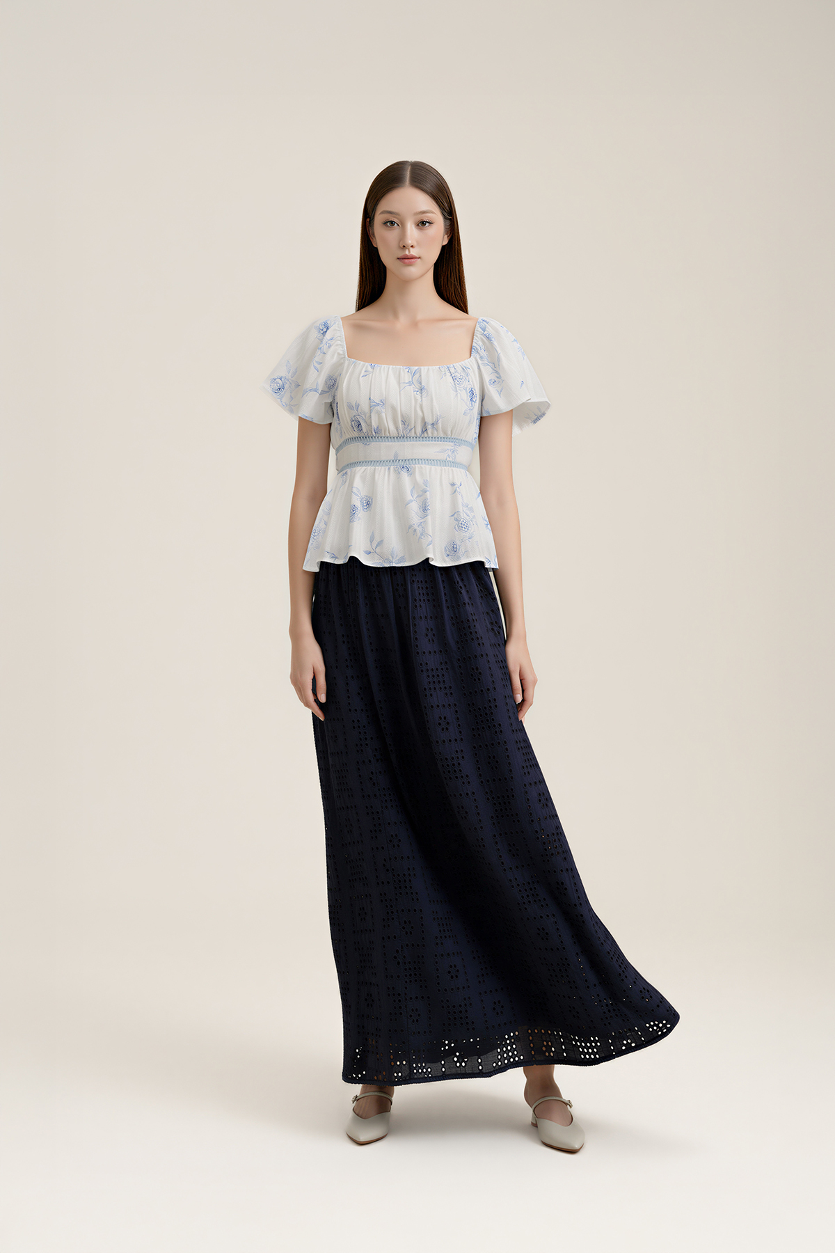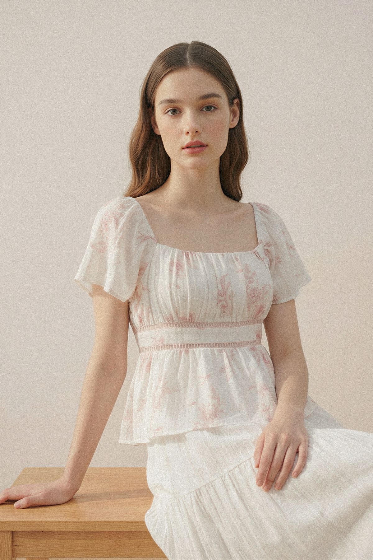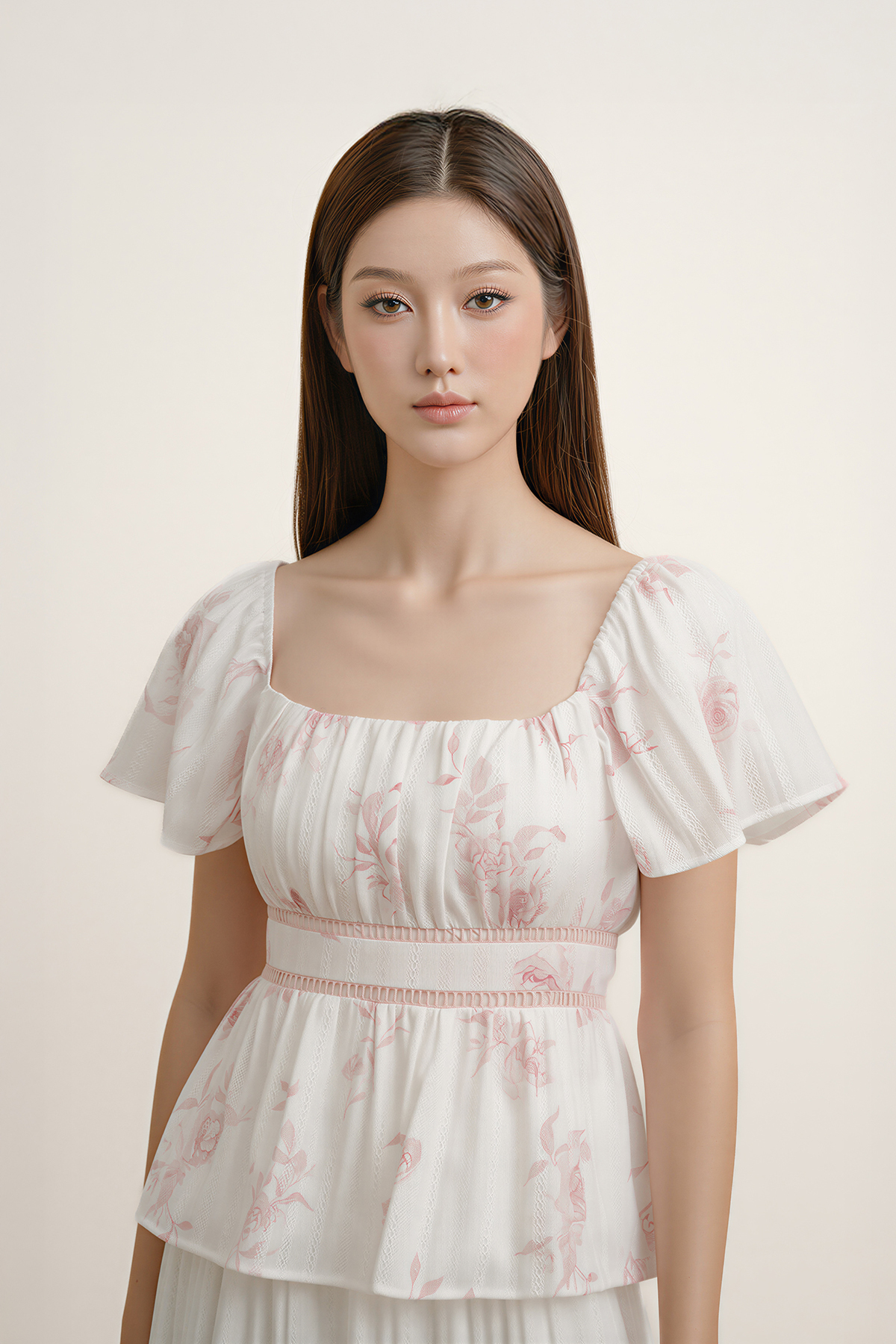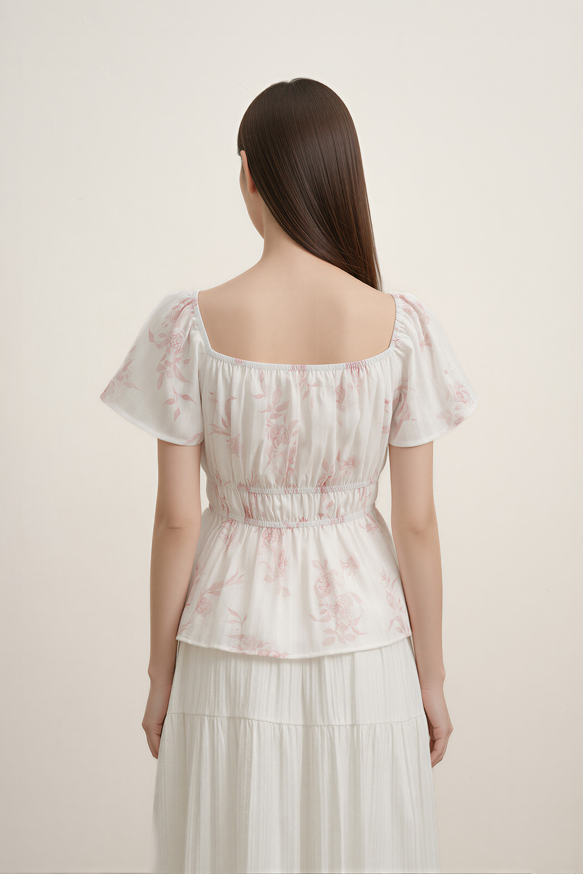 Light, feminine, and easy to wear. With flutter sleeves, delicate waist detailing, and a shirred back, this top balances polish and comfort—an effortless addition to your everyday lineup.
