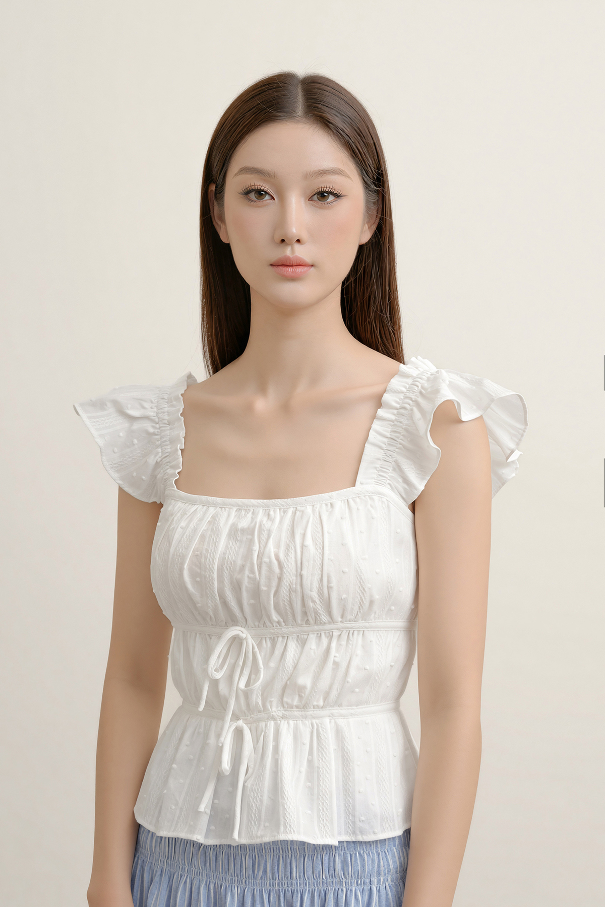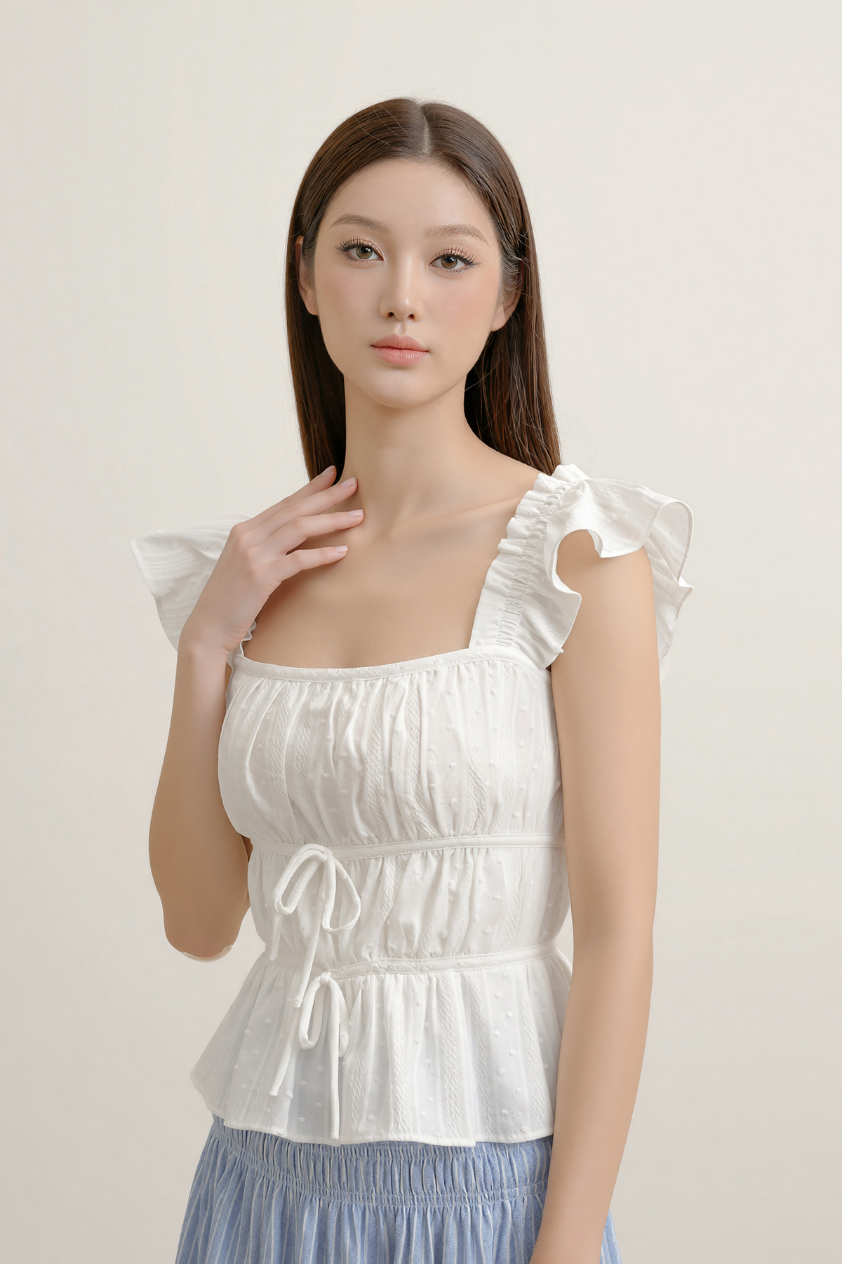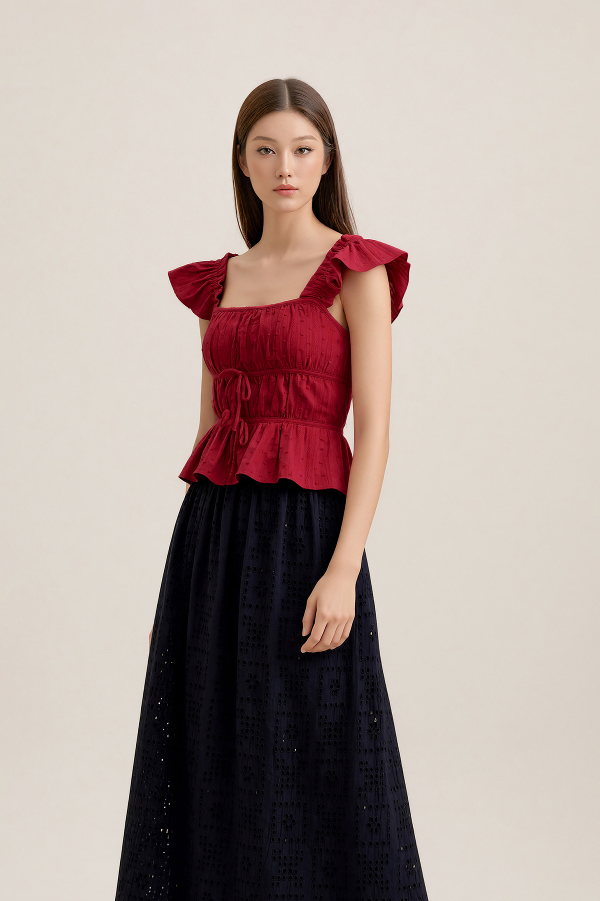 Romantic touches, made easy. The Lovie Padded Broderie Ruffle Top is designed with ruffle sleeves, a double waistband for definition, and delicate double ribbon ties. Light padding adds comfort and shape—pretty, polished, and ready for any plan.