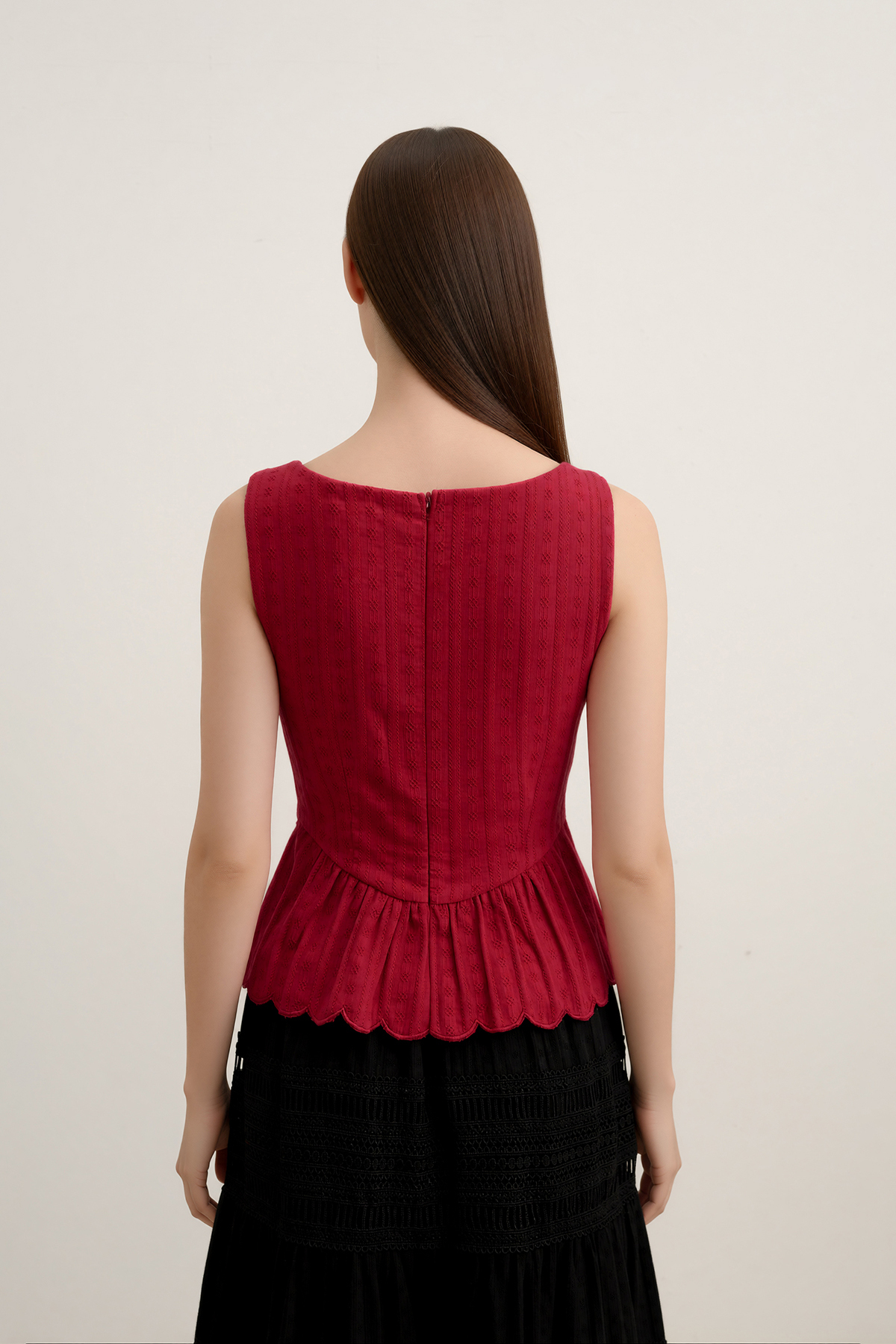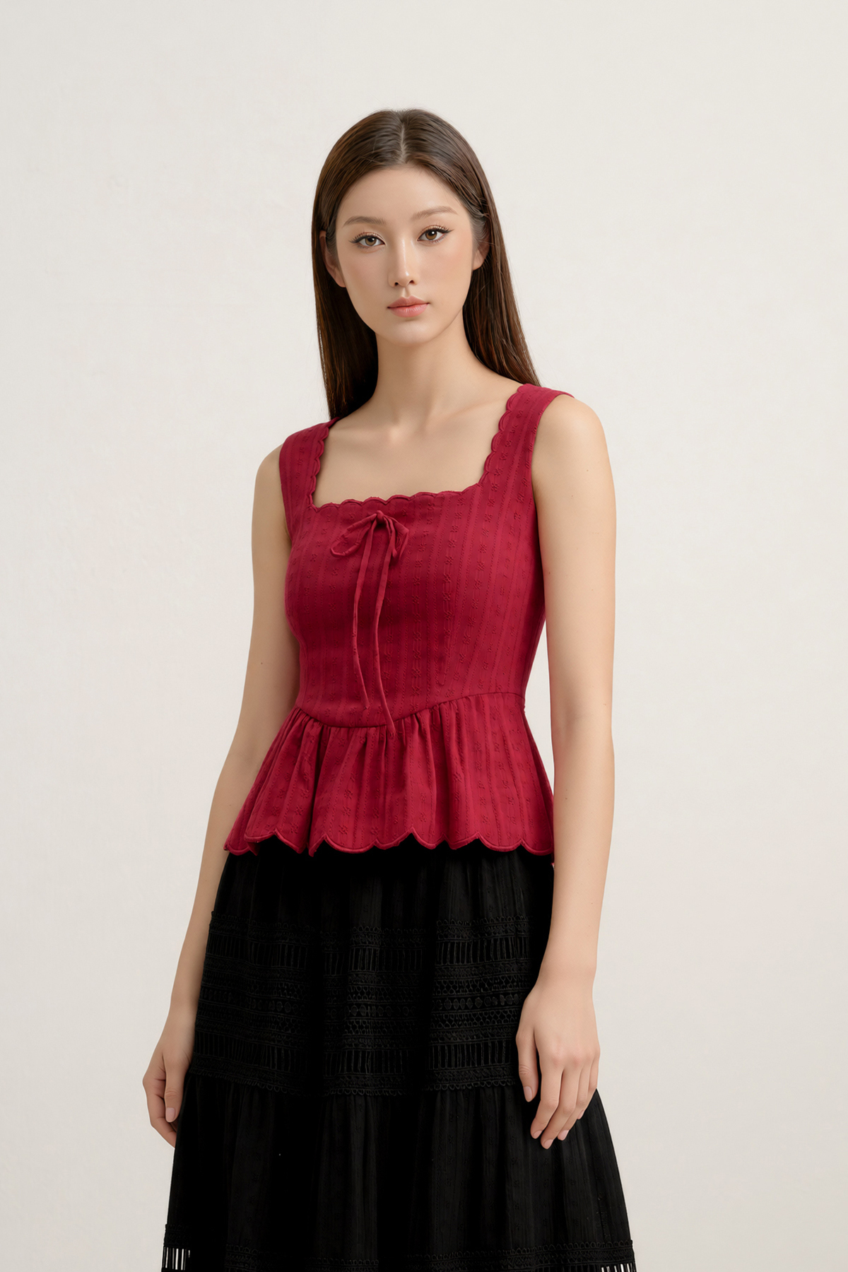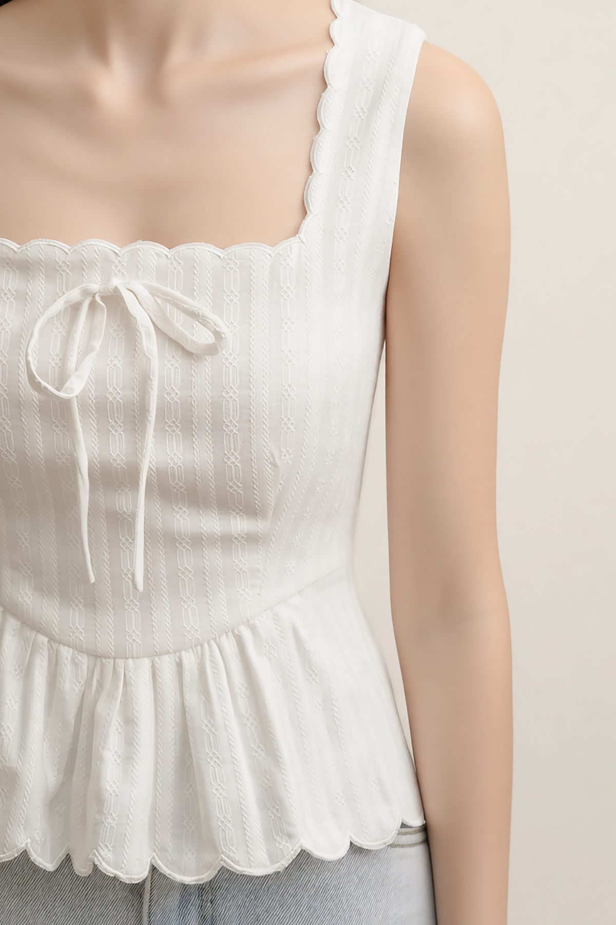 Sweet details, softly structured. The Fayelle Textured Scallop Top features a scalloped neckline and hem with a gently curved waist that flatters just right. Finished with a ribbon tie and subtle padding for shape, this peplum piece brings charm to everyday dressing.