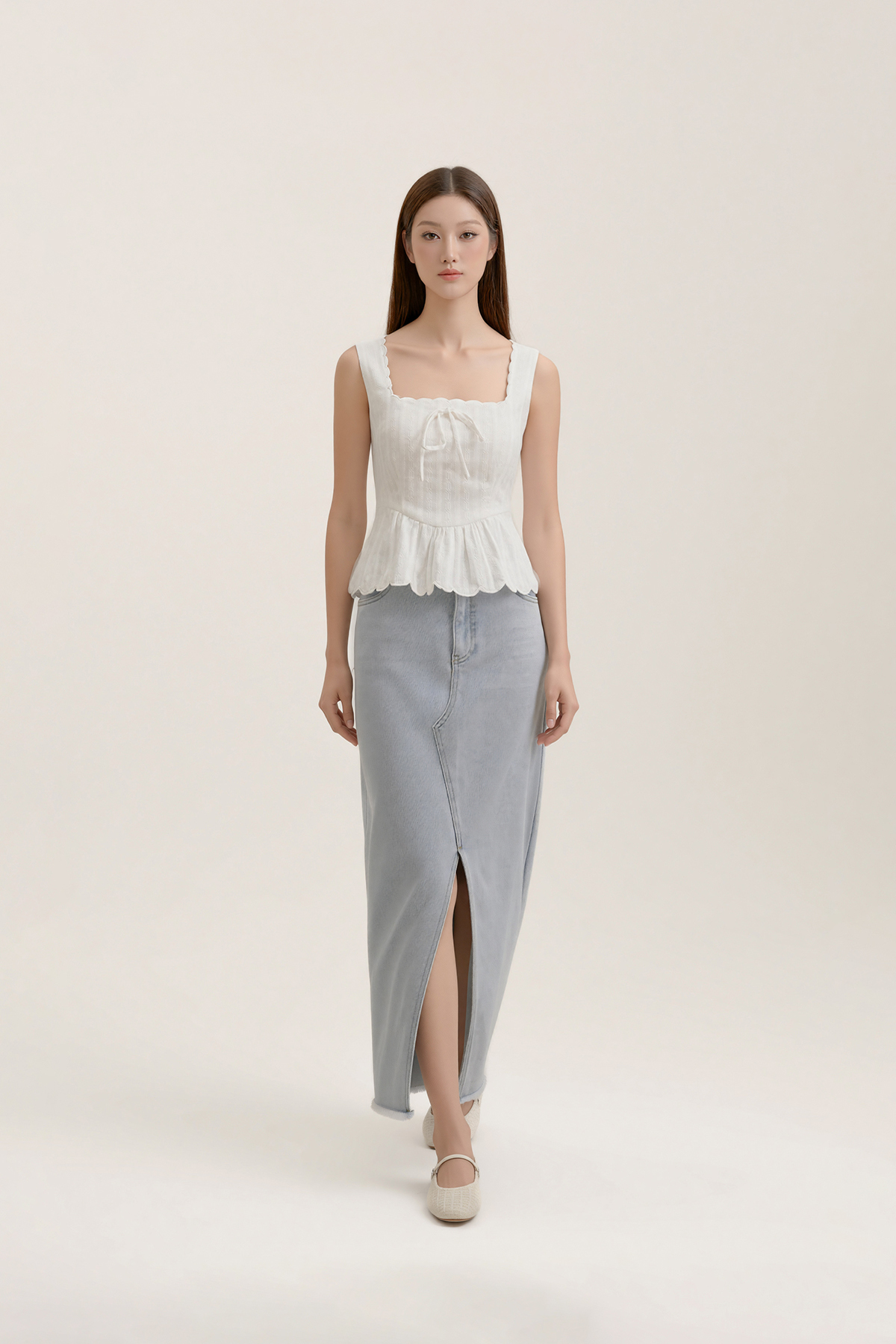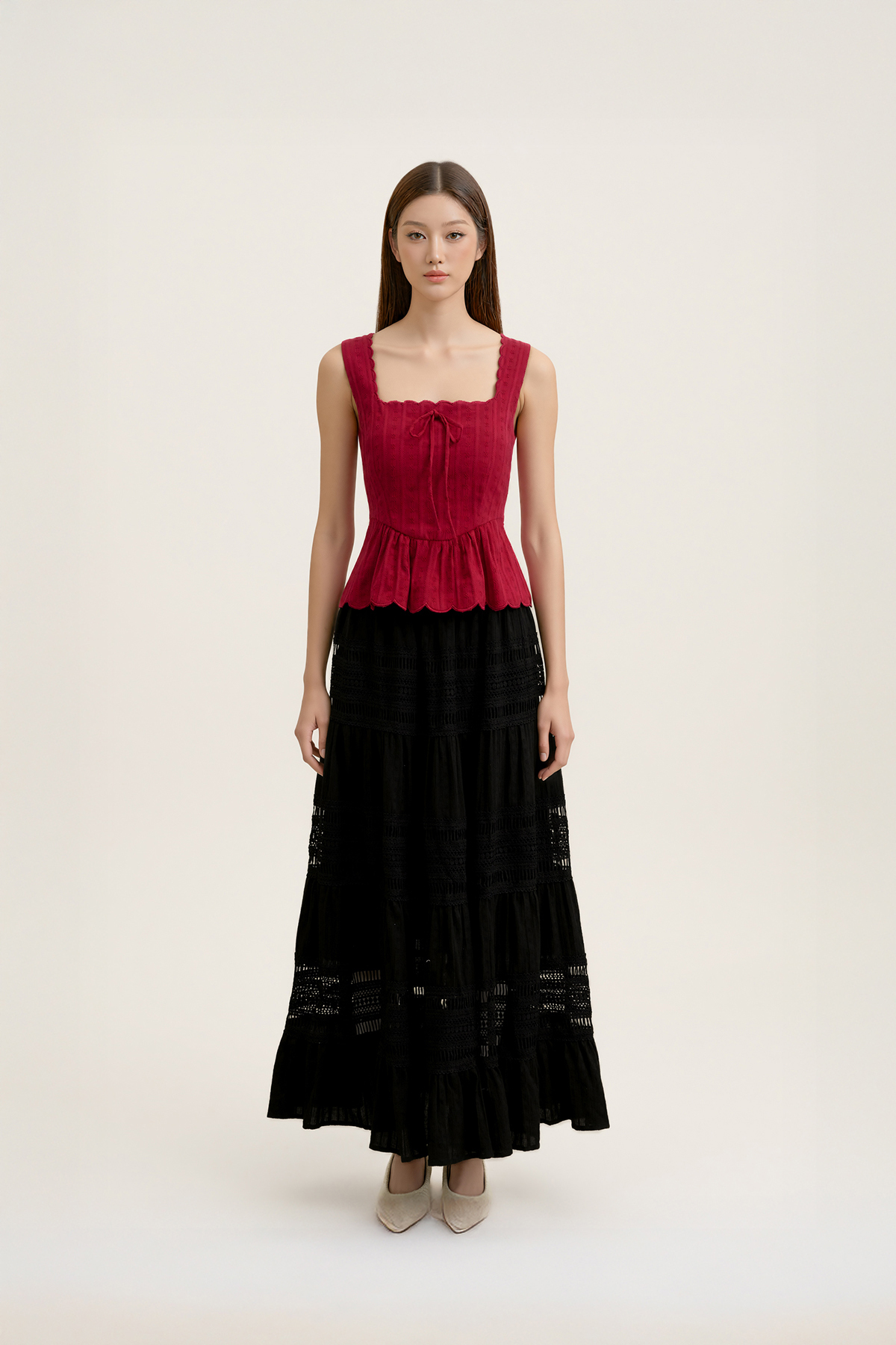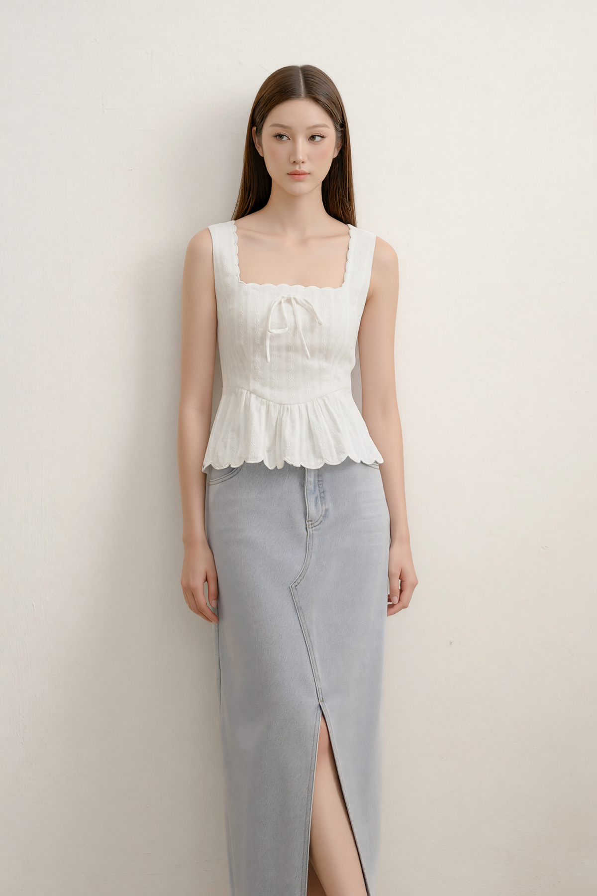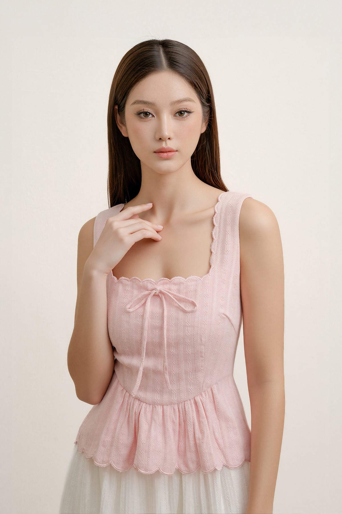 Sweet details, softly structured. The Fayelle Textured Scallop Top features a scalloped neckline and hem with a gently curved waist that flatters just right. Finished with a ribbon tie and subtle padding for shape, this peplum piece brings charm to everyday dressing.